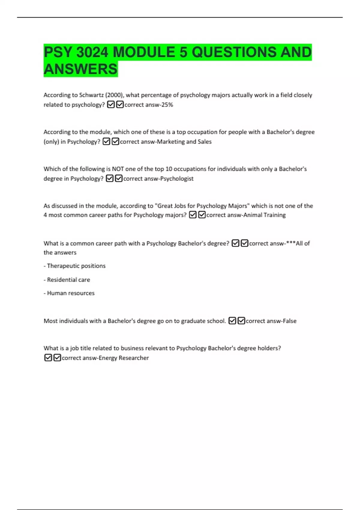 PSY 3024 MODULE 5 QUESTIONS AND ANSWERS According to Schwartz (2000), what percentage of psychology majors actually work in a field closely related to psychology? correct answ-25% According to the module, which one of these is a top occupation for people with a Bachelor's degree (only) in Psychology? correct answ-Marketing and Sales Which of the following is NOT one of the top 10 occupations for individuals with only a Bachelor's degree in Psychology? correct answ-Psychologist