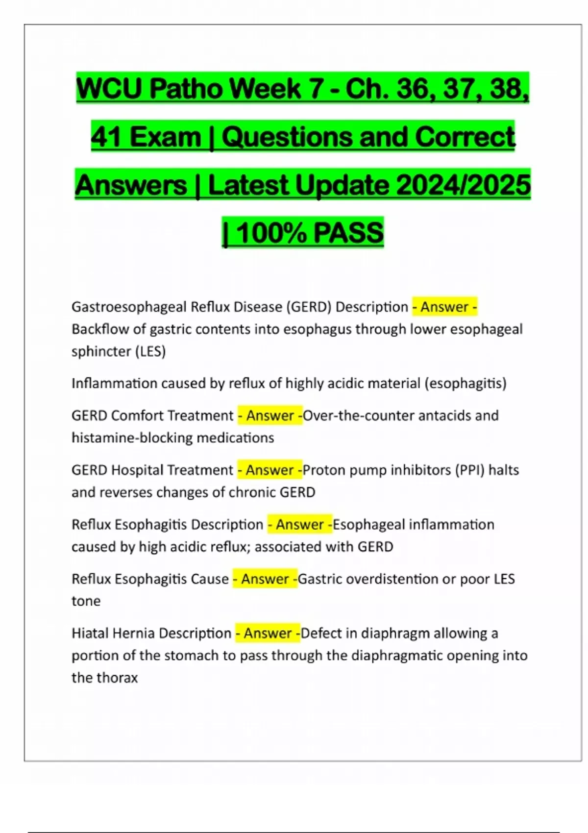 WCU Patho Week 7 - Ch. 36, 37, 38, 41 Exam | Questions and Correct Answers | Latest Update 2024/2025 | 100% PASS Gastroesophageal Reflux Disease (GERD) Description - Answer - Backflow of gastric contents into esophagus through lower esophageal sphincter (LES) Inflammation caused by reflux of highly acidic material (esophagitis) GERD Comfort Treatment - Answer -Over-the-counter antacids and histamine-blocking medications GERD Hospital Treatment - Answer -Proton pump inhibitors (PPI) ha