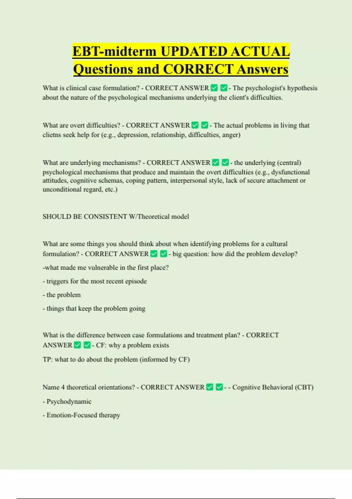 Name 4 theoretical orientations? - CORRECT ANSWER - - Cognitive Behavioral (CBT)