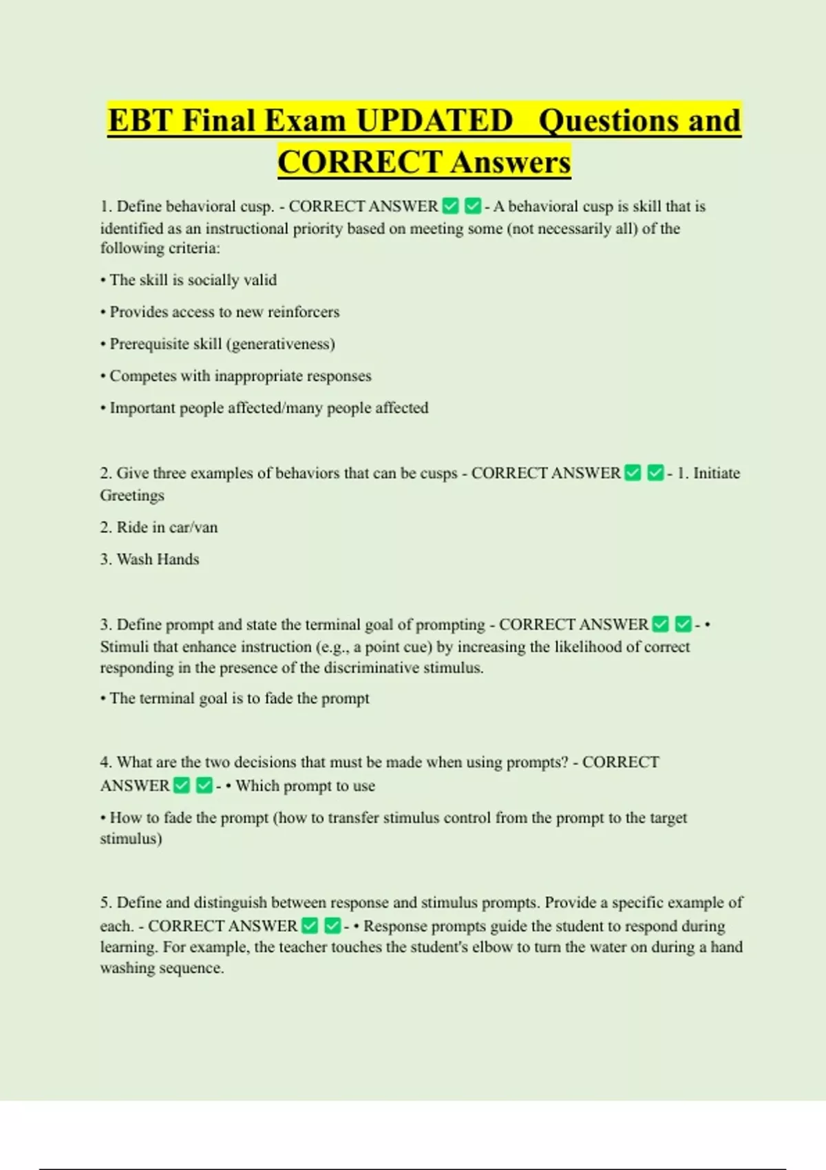 EBT Final Exam UPDATED Questions and CORRECT Answers 1. Define behavioral cusp. - CORRECT ANSWER - A behavioral cusp is skill that is identified as an instructional priority based on meeting some (not necessarily all) of the following criteria: • The skill is socially valid • Provides access to new reinforcers • Prerequisite skill (generativeness) • Competes with inappropriate responses • Important people affected/many people affected