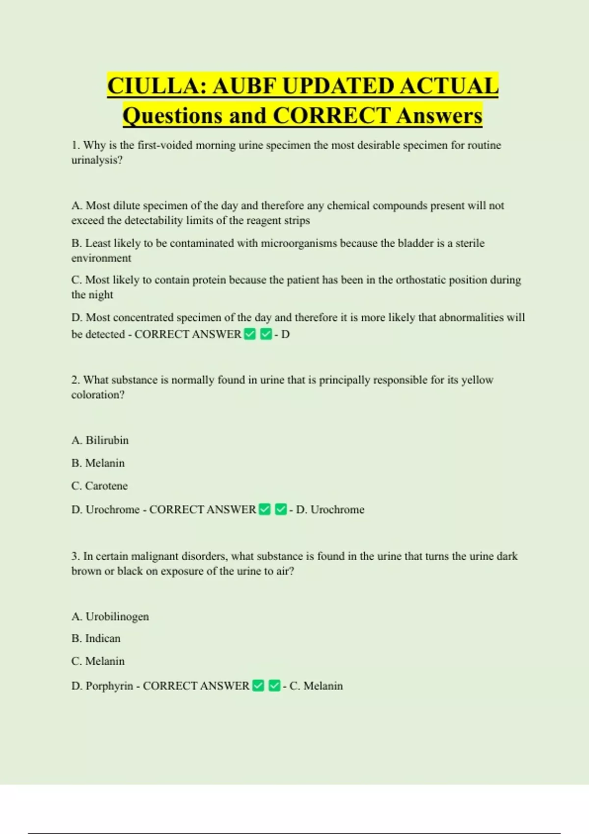 CIULLA: AUBF UPDATED ACTUAL Questions and CORRECT Answers 1. Why is the first-voided morning urine specimen the most desirable specimen for routine urinalysis? A. Most dilute specimen of the day and therefore any chemical compounds present will not exceed the detectability limits of the reagent strips B. Least likely to be contaminated with microorganisms because the bladder is a sterile environment C. Most likely to contain protein because the patient has been in the orthostatic position during the night D. Most concentrated specimen of the day and therefore it is more likely that abnormalities will be detected - CORRECT ANSWER - D