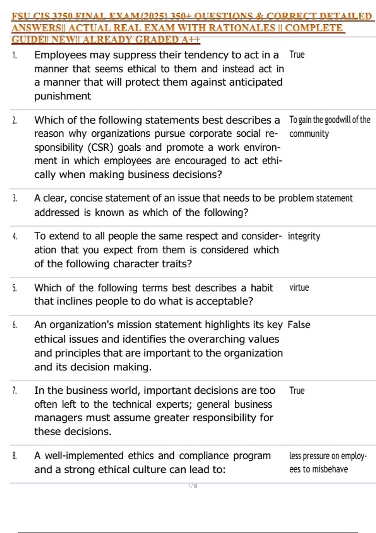 FSU CIS 3250 FINAL EXAM{2025} 350+ QUESTIONS & CORRECT DETAILED ANSWERS|| ACTUAL REAL EXAM WITH RATIONALES || COMPLETE GUIDE|| NEW|| ALREADY GRADED A++ 1. Employees may suppress their tendency to act in a manner that seems ethical to them and instead act in a manner that will protect them against anticipated punishment 2. Which of the following statements best describes a reason why organizations pursue corporate social re- sponsibility (CSR) goals and promote a work environ- ment in which employees are encouraged to act ethi- cally when making business decisions? True To gain the goodwill of the community 3. A clear, concise statement of an issue that needs to be problem statement addressed is known as which of the following? 4. To extend to all people the same respect and consider- integrity ation that you expect from them is considered which of the following character traits? 5. Which of the following terms best describes a habit that inclines people to do what is acceptable? virtue 6. An organization's mission statement highlights its key False ethical issues and identifies the overarching values and principles that are important to the organization and its decision making. 7. In the business world, important decisions are too often left to the technical experts; general business managers must assume greater responsibility for these decisions. 8. A well-implemented ethics and compliance program and a strong ethical culture can lead to: True less pressure on employ- ees to misbehave