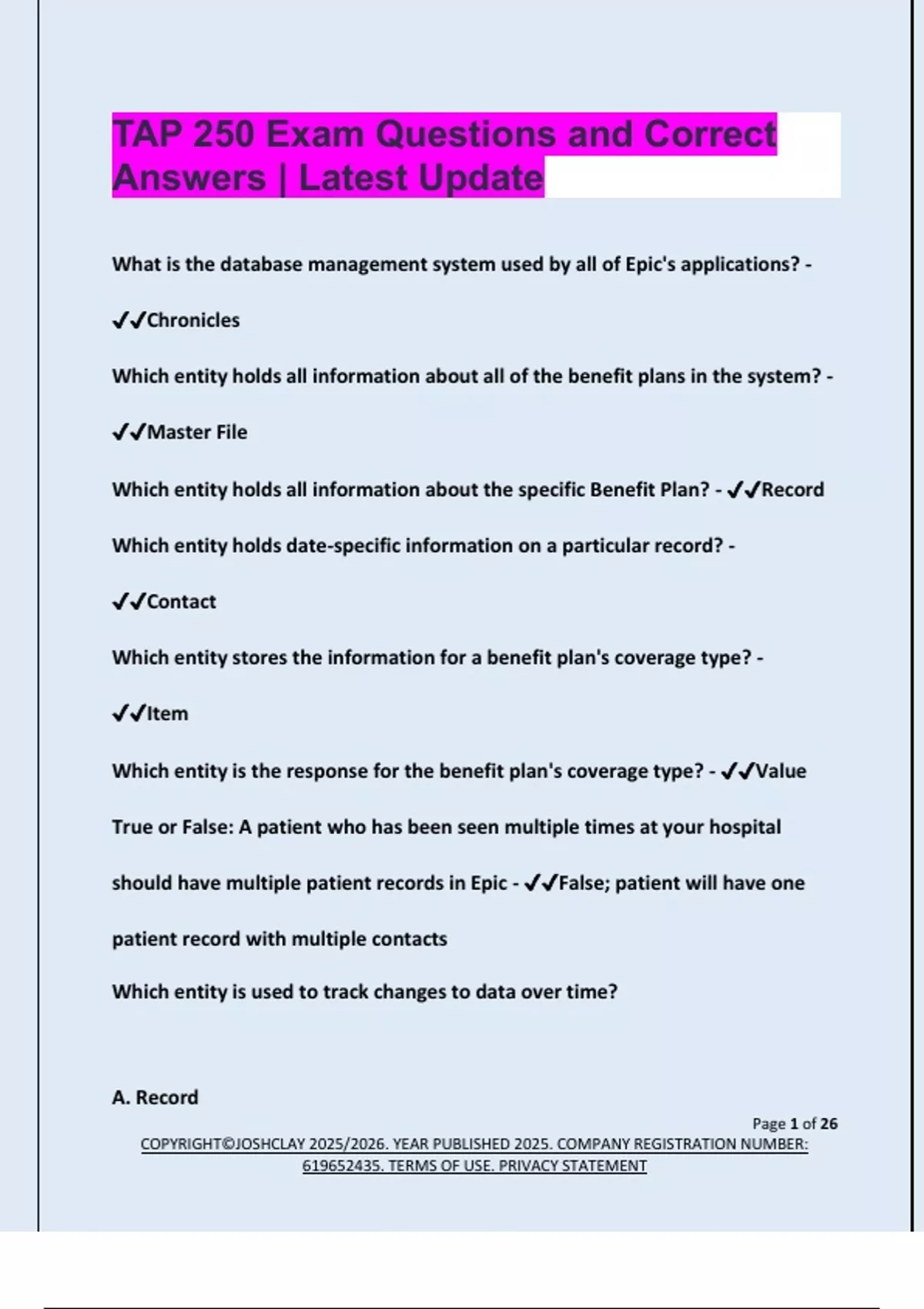 TAP 250 Exam Questions and Correct Answers | Latest Update What is the database management system used by all of Epic's applications? - Chronicles Which entity holds all information about all of the benefit plans in the system? - Master File Which entity holds all information about the specific Benefit Plan? - Record Which entity holds date-specific information on a particular record? - Contact Which entity stores the information for a benefit plan's coverage type? - Item Which entity is the response for the benefit plan's coverage type? - Value True or False: A patient who has been seen multiple times at your hospital should have multiple patient records in Epic - False; patient will have one patient record with multiple contacts Which entity is used to track changes to data over time? A. Recor