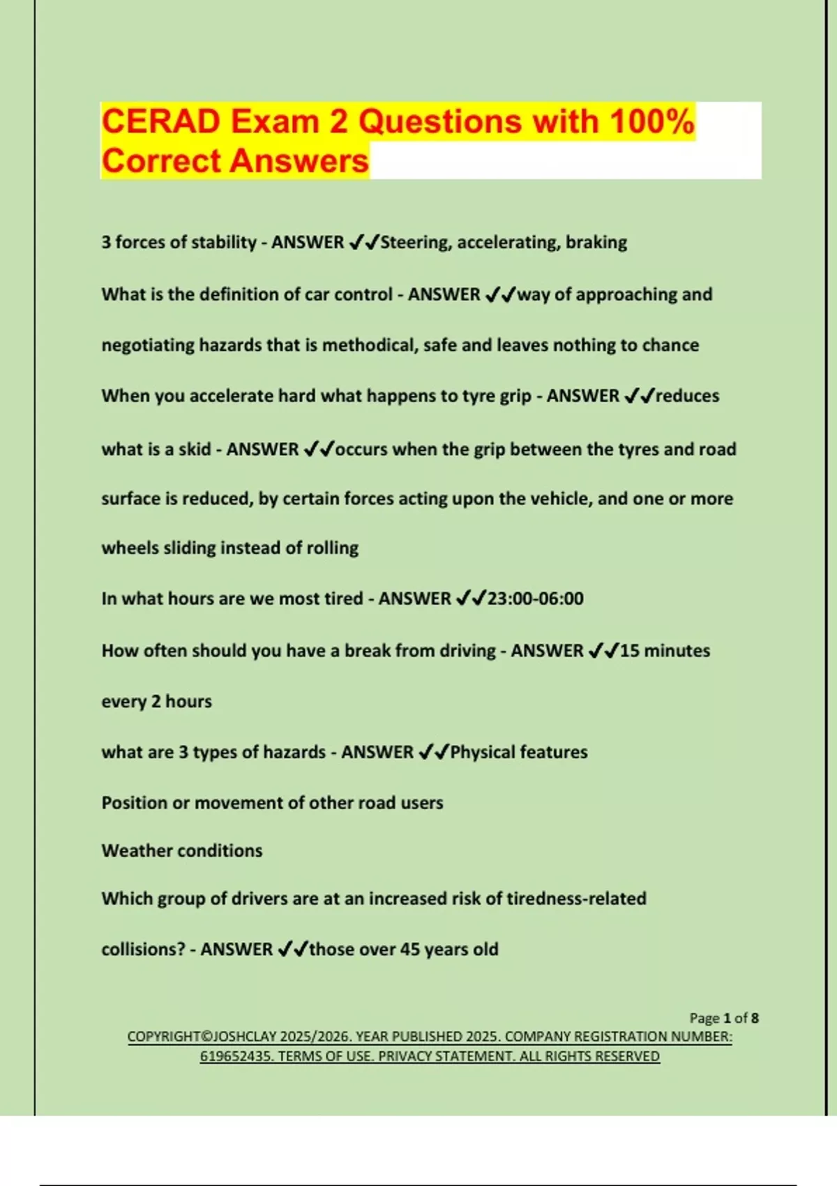 CERAD Exam 2 Questions with 100% Correct Answers 3 forces of stability - ANSWER Steering, accelerating, braking What is the definition of car control - ANSWER way of approaching and negotiating hazards that is methodical, safe and leaves nothing to chance When you accelerate hard what happens to tyre grip - ANSWER reduces what is a skid - ANSWER occurs when the grip between the tyres and road surface is reduced, by certain forces acting upon the vehicle, and one or more wheels sliding instead of rolling In what hours are we most tired - ANSWER 23:00-06:00 How often should you have a break from driving - ANSWER 15 minutes every 2 hours what are 3 types of hazards - ANSWER Physical features Position or movement of other road users Weather conditions Which group of drivers are at an increased risk of tiredness-related collisions? - ANSWER those over 45 years old