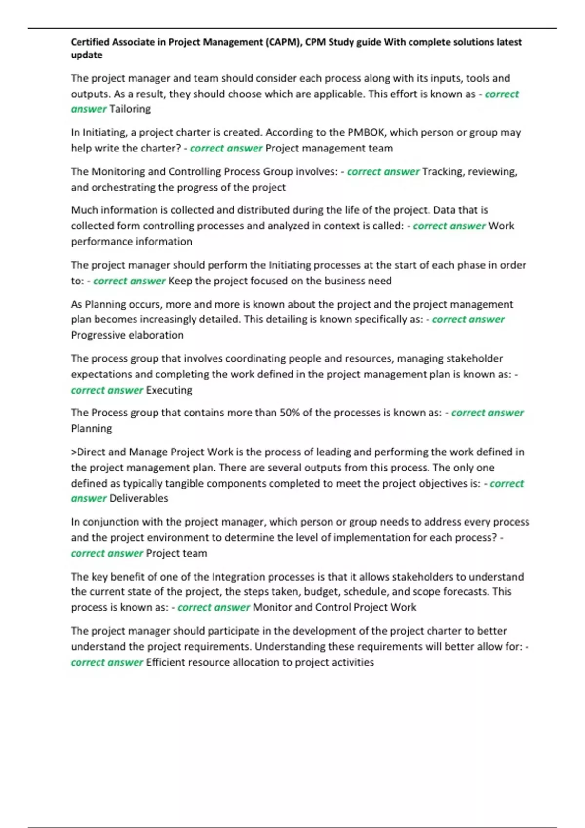 Certified Associate in Project Management (CAPM), CPM Study guide With complete solutions latest update/Certified Associate in Project Management (CAPM), CPM Study guide With complete solutions latest update/Certified Associate in Project Management (CAPM), CPM Study guide With complete solutions latest update