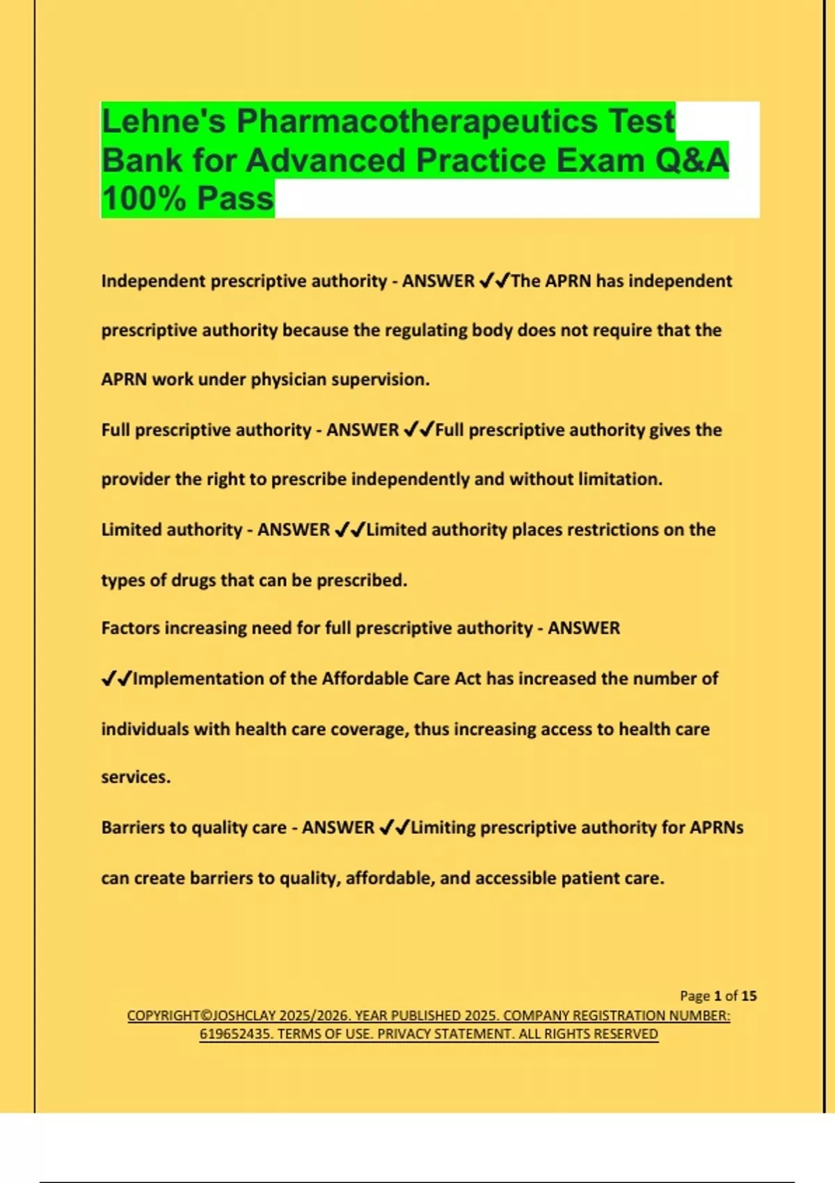 Lehne's Pharmacotherapeutics Test Bank for Advanced Practice Exam Q&A 100% Pass Independent prescriptive authority - ANSWER The APRN has independent prescriptive authority because the regulating body does not require that the APRN work under physician supervision. Full prescriptive authority - ANSWER Full prescriptive authority gives the provider the right to prescribe independently and without limitation. Limited authority - ANSWER Limited authority places restrictions on the types of drugs that can be prescribed. Factors increasing need for full prescriptive authority - ANSWER Implementation of the Affordable Care Act has increased the number of individuals with health care coverage, thus increasing access to health care services. Barriers to quality care - ANSWER Limiting prescriptive authority for APRNs can create barriers to quality, affordable, and accessible patient care