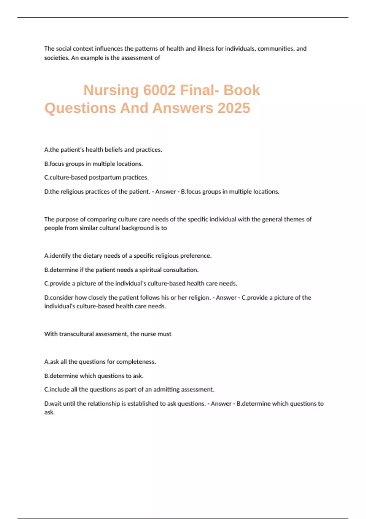 D.the religious practices of the patient. - Answer - B.focus groups in multiple locations.