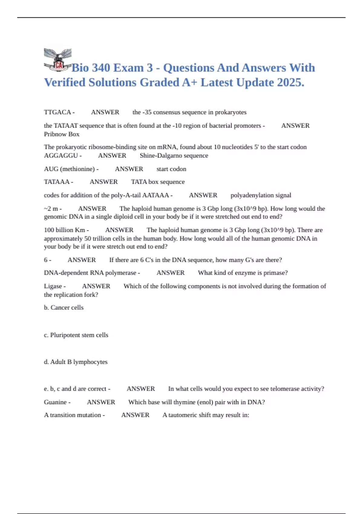 Bio 340 Exam 3 - Questions And Answers With Verified Solutions Graded A+ Latest Update 2025.