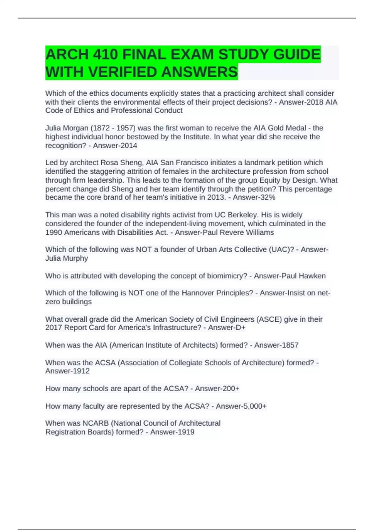 ARCH 410 FINAL EXAM STUDY GUIDE WITH VERIFIED ANSWERS