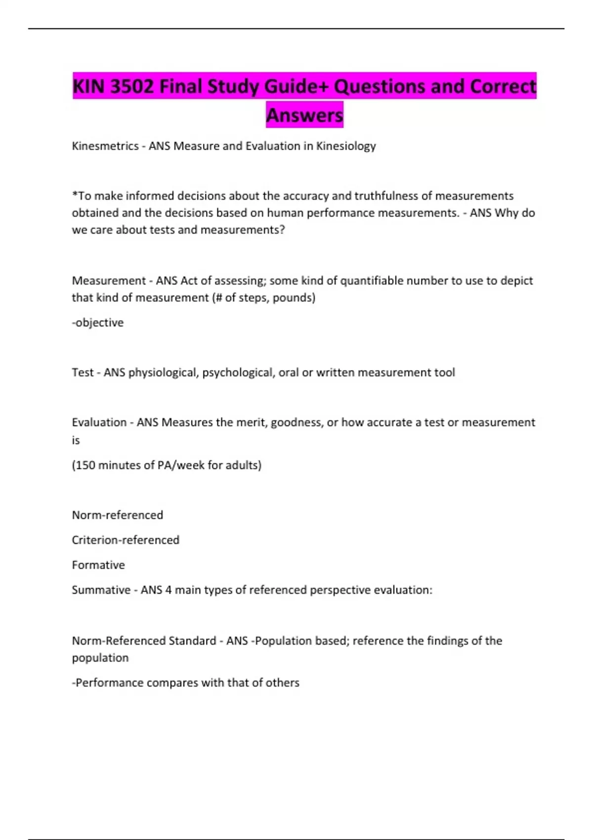 KIN 3502 Final Study Guide+ Questions and Correct Answers
