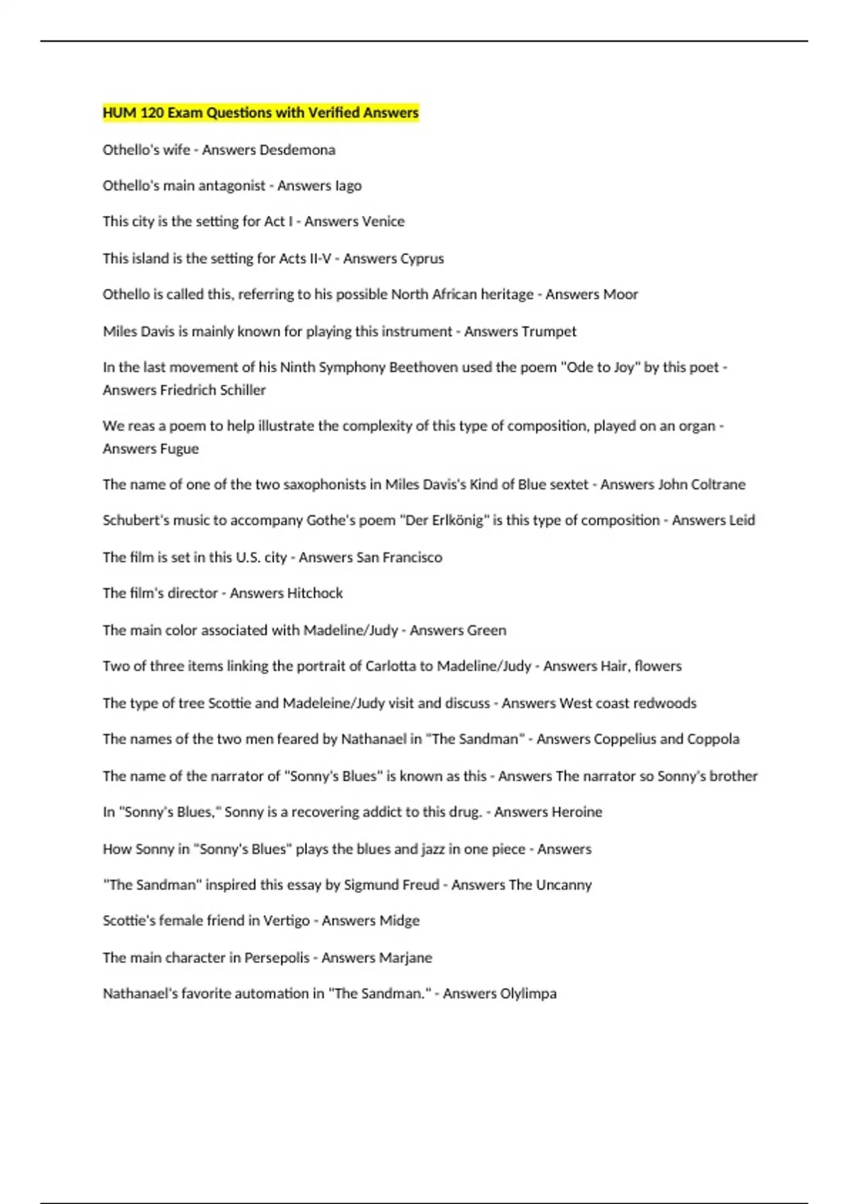 HUM 120 Exam Questions with Verified Answers Othello's wife - Answers Desdemona Othello's main antagonist - Answers Iago This city is the setting for Act I - Answers Venice This island is the setting for Acts II-V - Answers Cyprus Othello is called this, referring to his possible North African heritage - Answers Moor Miles Davis is mainly known for playing this instrument - Answers Trumpet In the last movement of his Ninth Symphony Beethoven used the poem "Ode to Joy" by this poet - Answers Friedrich Schiller We reas a poem to help illustrate the complexity of this type of composition, played on an organ - Answers Fugue The name of one of the two saxophonists in Miles Davis's Kind of Blue sextet - Answers John Coltrane Schubert's music to accompany Gothe's poem "Der Erlkönig" is this type of composition - Answers Leid The film is set in this U.S. city - Answers San Francisco The film's director - Answers Hitchock The main color associated with Madeline/Judy - Answers Green Two of three items linking the portrait of Carlotta to Madeline/Judy - Answers Hair, flowers The type of tree Scottie and Madeleine/Judy visit and discuss - Answers West coast redwoods The names of the two men feared by Nathanael in "The Sandman" - Answers Coppelius and Coppola The name of the narrator of "Sonny's Blues" is known as this - Answers The narrator so Sonny's brother In "Sonny's Blues," Sonny is a recovering addict to this drug. - Answers Heroine How Sonny in "Sonny's Blues" plays the blues and jazz in one piece - Answers "The Sandman" inspired this essay by Sigmund Freud - Answers The Uncanny Scottie's female friend in Vertigo - Answers Midge The main character in Persepolis - Answers Marjane