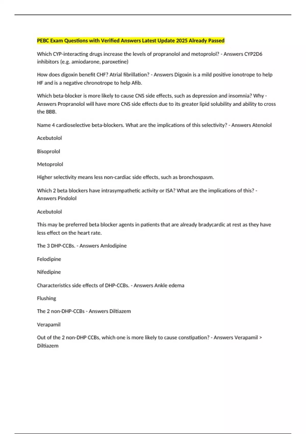PEBC Exam Questions with Verified Answers Latest Update 2025 Already Passed Which CYP-interacting drugs increase the levels of propranolol and metoprolol? - Answers CYP2D6 inhibitors (e.g. amiodarone, paroxetine) How does digoxin benefit CHF? Atrial fibrillation? - Answers Digoxin is a mild positive ionotrope to help HF and is a negative chronotrope to help Afib. Which beta-blocker is more likely to cause CNS side effects, such as depression and insomnia? Why - Answers Propranolol will have more CNS side effects due to its greater lipid solubility and ability to cross the BBB. Name 4 cardioselective beta-blockers. What are the implications of this selectivity? - Answers Atenolol Acebutolol Bisoprolol Metoprolol Higher selectivity means less non-cardiac side effects, such as bronchospasm. Which 2 beta blockers have intrasympathetic activity or ISA? What are the implications of this? - Answers Pindolol Acebutolol This may be preferred beta blocker agents in patients that are already bradycardic at rest as they have less effect on the heart rate. The 3 DHP-CCBs. - Answers Amlodipine Felodipine Nifedipine Characteristics side effects of DHP-CCBs. - Answers Ankle edema Flushing The 2 non-DHP-CCBs - Answers Diltiazem Verapamil Out of the 2 non-DHP CCBs, which one is more likely to cause constipation? - Answers Verapamil > Diltiazem Instructions on how to use nitroglycerin SL tablets or spray. - Answers Use 1 spray or tablet when anginal symptoms occur. Use 1 dose every 5 minutes for a total of 3 doses. If there is no improvement after the first dose or no resolution after 3 doses, seek medical help (call ambulance)! Characteristic side effect of nitrates. - Answers Headache! How does verapamil interact with digoxin? - Answers Verapamil reduces the renal clearance of digoxin, increasing digoxin levels. Where do nitrates have their effect? - Answers Veins! Reduces afterload! Why must individuals have a 10-12 hour nitrate-free period? - Answers To prevent tolerance! Characteristic drug interaction with nitrates. - Answers PDE-5 Inhibitors (sildenafil, tadalafil, vardenafil) Definition of syncope - Answers Reversible loss of consciousness not requiring resuscitative measures or related to a seizure Non-pharmacological options for vasovagal syncope. - Answers Increased sodium intake (3-5 grams daily) and fluid intake (2.5 L). Effects of fludrocortisone. - Answers Potent mineralcorticoid: retains sodium, increases loss of potassium Glucocorticoid effects as well Non-pharmacological choices for orthostatic hypotension - Answers Avoid hypotensive, volume depleting drugs as much as possible. Increased sodium and fluid intake. Elevate head while laying down. Avoid hemodynamic stress (e.g. getting up too quickly). Drug(s) that can be used for both vasovagal syncope and orthostatic hypotension. - Answers Fludrocortisone Midodrine (?) MOA of midodrine - Answers Increases venous return through venoconstriction and arterial constriction to increase blood pressure. Drugs used for orthostatic hypotension - Answers Fludrocortisone Indomethacin Midodrine Non-selective beta-blockers Characteristic side effect of midodrine - Answers Supine hypertension Shivering What class of drug does midodrine belong to? - Answers Alpha-1 adrenergic agonists Most likely pathogen causing osteomyelitis. - Answers Staphylococcus aureus What type of dressing for diabetic foot infections are preferred? - Answers Moist wound dressings Initial therapy for diabetic foot infections should target which pathogens? - Ans