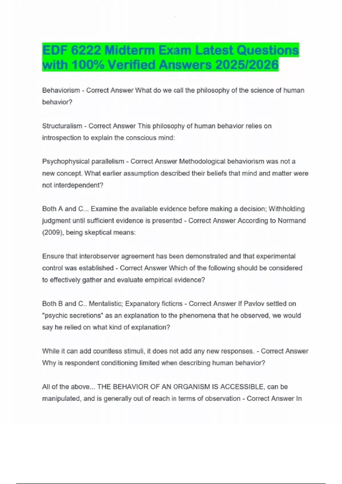 EDF 6222 Midterm Exam Latest Questions with 100% Verified Answers 2025/2026 Behaviorism - Correct Answer What do we call the philosophy of the science of human behavior? Structuralism - Correct Answer This philosophy of human behavior relies on introspection to explain the conscious mind: Psychophysical parallelism - Correct Answer Methodological behaviorism was not a new concept. What earlier assumption described their beliefs that mind and matter were not interdependent? Both A and C... Examine the available evidence before making a decision; Withholding judgment until sufficient evidence is presented - Correct Answer According to Normand (2009), being skeptical means: Ensure that interobserver agreement has been demonstrated and that experimental control was established - Correct Answer Which of the following should be considered to effectively gather and evaluate empirical evidence? Both B and C.. Mentalistic; Expanatory fictions - Correct Answer If Pavlov settled on "psychic secretions" as an explanation to the phenomena that he observed, we would say he relied on what kind of explanation? While it can add countless stimuli, it does not add any new responses. - Correct Answer Why is respondent conditioning limited when describing human behavior?