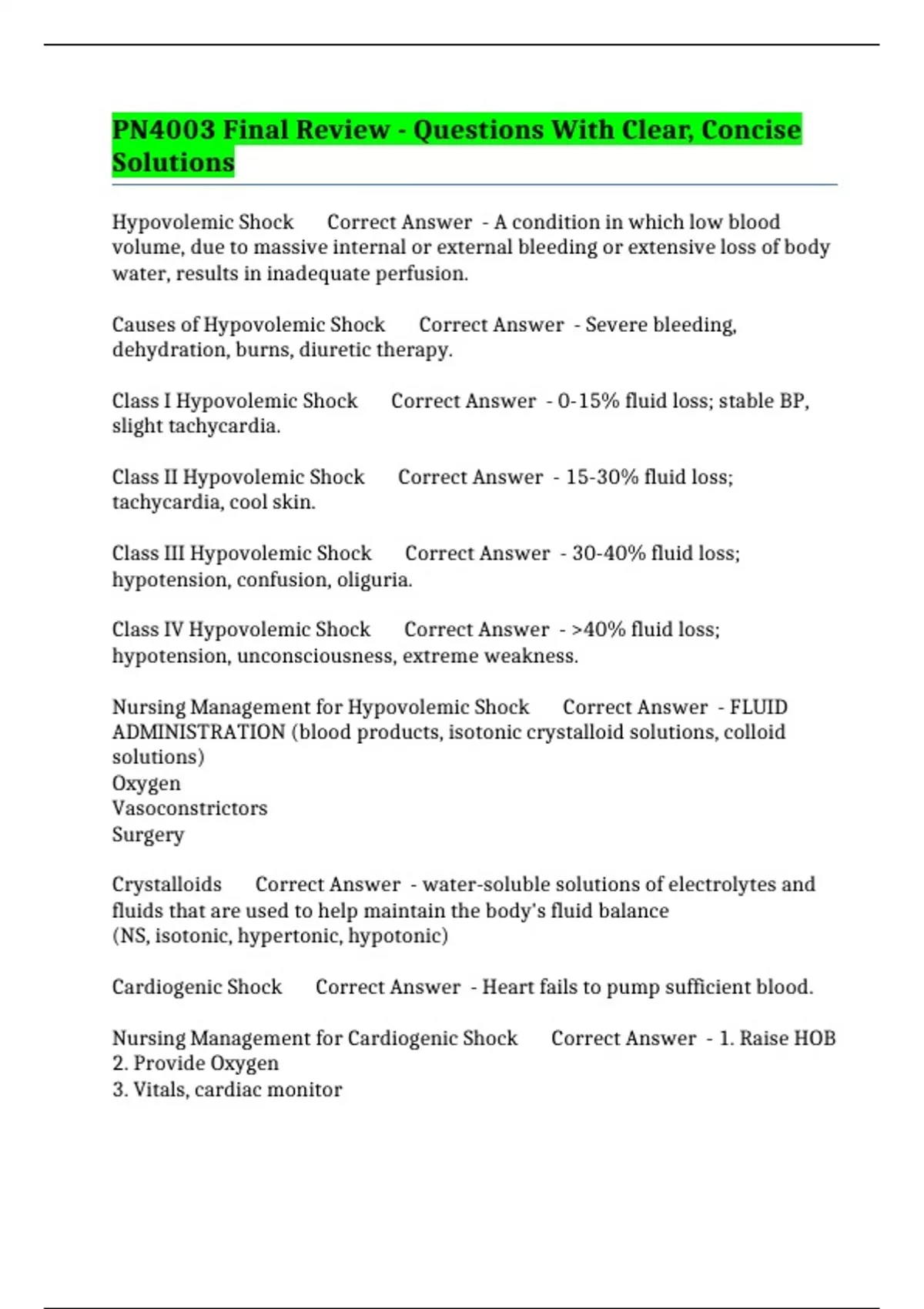 Nursing Management for Hypovolemic Shock Correct Answer - FLUID