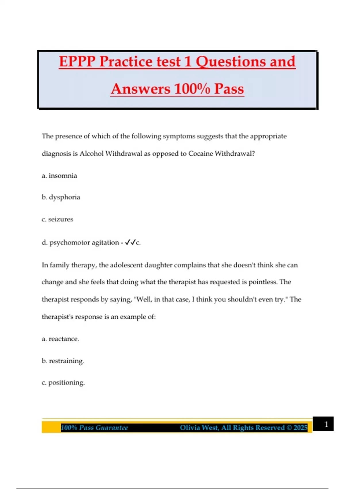 EPPP Practice test 1 Questions and Answers 100% Pass The presence of which of the following symptoms suggests that the appropriate diagnosis is Alcohol Withdrawal as opposed to Cocaine Withdrawal? a. insomnia b. dysphoria c. seizures d. psychomotor agitation - c. In family therapy, the adolescent daughter complains that she doesn't think she can change and she feels that doing what the therapist has requested is pointless. The therapist responds by saying, "Well, in that case, I think you shouldn't even try." The therapist's response is an example of: a. reactance. b. restraining. c. positioning. 2100% Pass Guarantee Olivia West, All Rights Reserved © 2025 d. prescription. - b. According to Patterson and his colleagues, aggression in children is linked to the use of coercive discipline by their parents. In turn, the parent's use of coercive discipline is directly related to: a. the parents' misinterpretations of the child's intentions when he or she misbehaves. b. the parents' personality characteristics and the child's temperament. c. the nature of the attachment between the child and the parent. d. the effectiveness of the discipline in stopping the child's misbehavior. - b. A person with a temporal lobe tumor is most likely to exhibit which of the following? a. memory impairment, depression or anxiety, and hallucinations b. poor judgment, impulsivity, and inappropriate jocularity c. confabulation, irritability and suspiciousness, and prosopagnosia d. dysgraphia, depression and apathy, and denial of his or her problems - a. According to the path-goal theory of leadership, a primary task of a leader is to help subordinates find the best path for attaining goals. In terms of leadership style, this theory proposes that: a. the best style (directive, supportive, participative, or achievement-oriented) depends on certain characteristics of the task and the subordinates. 3100% Pass Guarantee Olivia West, All Rights Reserved © 2025 b. the best style (directive, supportive, participative, or achievement-oriented) depends on the leader's experience, personality, and so on. c. the best style is a participative one that allows employees to help set their own goals. d. the best style is an achievement-oriented one that focuses on enhancing the skills and knowledge of subordinates so that they are better able to achieve their goals. - a. Research on mnemonic devices suggests that they are: a. superior to rote rehearsal in terms of both short-and long-term retention. b. superior to rote rehearsal and elaboration in terms of both short-and long-term retention. c. superior to rote rehearsal in terms of short-term but not long-term retention. d. superior to rote rehearsal and elaboration in terms of short-term but not long-term retention. - c. In the assessment of cognitive abilities with a standardized test, you would "test the limits": a. before administering the test. b. before administering each subtest. c. after administering the test. d. whenever it seems appropriate to do so. - c. 4100% Pass Guarantee Olivia West, All Rights Reserved © 2025 A worker whose job consists primarily of handling customer complaints will be happier if he s/he blames the customer's problems on: a. external, stable, and global factors. b. internal, stable, and specific factors. c. external, unstable, and global factors. d. external, unstable, and specific factors. - d. You administer a test to a sample of young adults with PTSD and, from their scores, calculate a kappa coefficient of .95. This indicates that the test is: a. reliable. b. valid. c. reliable and valid. d. reliable but not valid. - a. You are hired by a small company to provide evaluation and counseling services to employees. The company owner tells you that employees routinely sign a waiver of confidentiality when they are hired. In this situation, you should: a. tell the employer that you can give her only very limited and relevant information about an employee even though the employee has signed a waiver. 5100% Pass Guarantee Olivia West, All Rights Reserved © 2025 b. clarify the company policy with the employees that you see and determine if they want to continue in counseling. c. provide the employer with information only after you have confirmed that the employee has actually signed the waiver. d. refuse to give the employer any information about the employees that you see. - b. An adolescent is brought to therapy by her mother who says the girl has recently become "another person." She says her daughter used to be easy-going and easy to get along with and was well-liked at school by her peers and teachers. However, now her daughter is constantly irritable, is smoking and drinking, and has started having trouble at school. When the therapist interviews the girl, he learns that she is engaging in high-risk sexual behavior, but the girl feels that nothing bad can ever happen