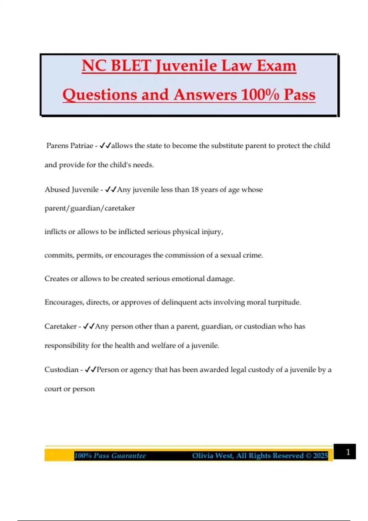 NC BLET Juvenile Law Exam Questions and Answers 100% Pass Parens Patriae - allows the state to become the substitute parent to protect the child and provide for the child's needs. Abused Juvenile - Any juvenile less than 18 years of age whose parent/guardian/caretaker inflicts or allows to be inflicted serious physical injury, commits, permits, or encourages the commission of a sexual crime. Creates or allows to be created serious emotional damage. Encourages, directs, or approves of delinquent acts involving moral turpitude. Caretaker - Any person other than a parent, guardian, or custodian who has responsibility for the health and welfare of a juvenile. Custodian - Person or agency that has been awarded legal custody of a juvenile by a court or person 2100% Pass Guarantee Olivia West, All Rights Reserved © 2025 Dependent juvenile - a juvenile in need of assistance or placement because the juvenile has no parent, guardian, or custodian Neglected Juvenile - A juvenile who does not receive proper care, supervision, or discipline from a parent, guardian, custodian, or caretaker; or who has been abandoned, or has not been provided necessary medical care. Three Quanta of Proof - 1. Preponderance of evidence. 2. Clear and convincing evidence. 3. Beyond a reasonable doubt. Allegations in a petition alleging abuse, neglect, or dependency shall be proved by - clear and convincing evidence. Juvenile court jurisdiction - Original jurisdiction over alleged abuse, neglect, or dependency cases. Termination parental rights, emancipation of a juvenile. Review placement in foster care. Consent for an abortion for an unemancipated minor. Emancipated Minor - Age 16-17 where you declare yourself independent of a guardian and are considered an adult, and can reasonably prove you are independent. Notify DSS immediately for - Emergency or non-emergency investigations of child abuse. 3100% Pass Guarantee Olivia West, All Rights Reserved © 2025 DSS - Department of Social Services Every person has a legal duty to - report facts which lead the person to suspect that a juvenile is abused, neglected, or dependent, or has died as a result of maltreatment. Steps in Answering Complaints - 1. Initial approach should be professional. 2. Explain to complainant the health and safety of the child is being considered. 3. Show concern/sympathy. 4. If refusal to enter home by parent/guardian, then probable cause is needed to enter it (i.e. exigent circumstances or a warrant.) 5. Interfering with an investigation is a crime. DSS must notify the SBI of a report of child sexual abuse at a daycare facility or home within - 24 hours or the next work day DSS must give written notice to a person making the report regarding whether the report of abuse allegations was true or not, and what act