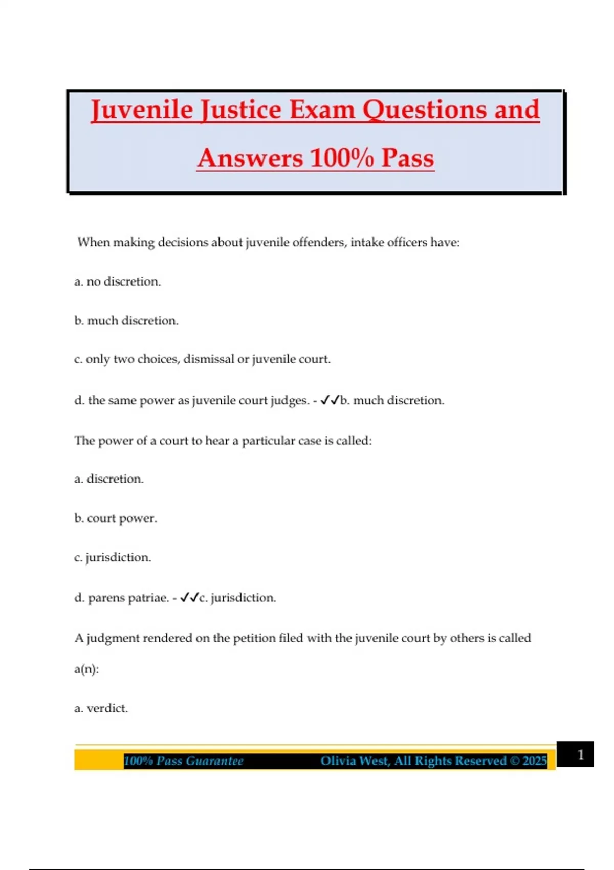 Juvenile Justice Exam Questions and Answers 100% Pass When making decisions about juvenile offenders, intake officers have: a. no discretion. b. much discretion. c. only two choices, dismissal or juvenile court. d. the same power as juvenile court judges. - b. much discretion. The power of a court to hear a particular case is called: a. discretion. b. court power. c. jurisdiction. d. parens patriae. - c. jurisdiction. A judgment rendered on the petition filed with the juvenile court by others is called a(n): a. verdict. 2100% Pass Guarantee Olivia West, All Rights Reserved © 2025 b. sentence. c. disposition. d. adjudication. - d. adjudication A conditional disposition would be: a. probation. b. a warning. c. secure confinement. d. placement in foster home. - a. probation When juveniles are apprehended by police for suspicious behavior, but not necessarily for any specific crime, they are: a. arrested. b. taken into custody. c. wards of the court. d. None of the above. - b. taken into custody Curfew ordinances are enacted as: a. delinquency prevention strategies. b. status offense strategies. 3100% Pass Guarantee Olivia West, All Rights Reserved © 2025 c. deinstitutionalization strategies. d. criminal court strategies. - a. delinquency prevention strategies. The age jurisdiction of juvenile courts is determined by: a. state governors. b. state legislatures. c. federal government. d. courts. - b. state legislatures. Those who support the "get-tough" approach believe juvenile offenders should be: a. punished. b. rehabilitated. c. treated. d. educated. - a. punished. Which of the following would NOT be considered a status offense? a. Running away from home b. Curfew violation c. Shoplifting 4100% Pass Guarantee Olivia West, All Rights Reserved © 2025 d. Truancy - c. Shoplifting The juvenile equivalent of an adult sentence is called a(n): a. adjudication. b. finding. c. disposition. d. petition. - c. disposition. Curfew laws have been enacted in many U.S. cities in an effort t