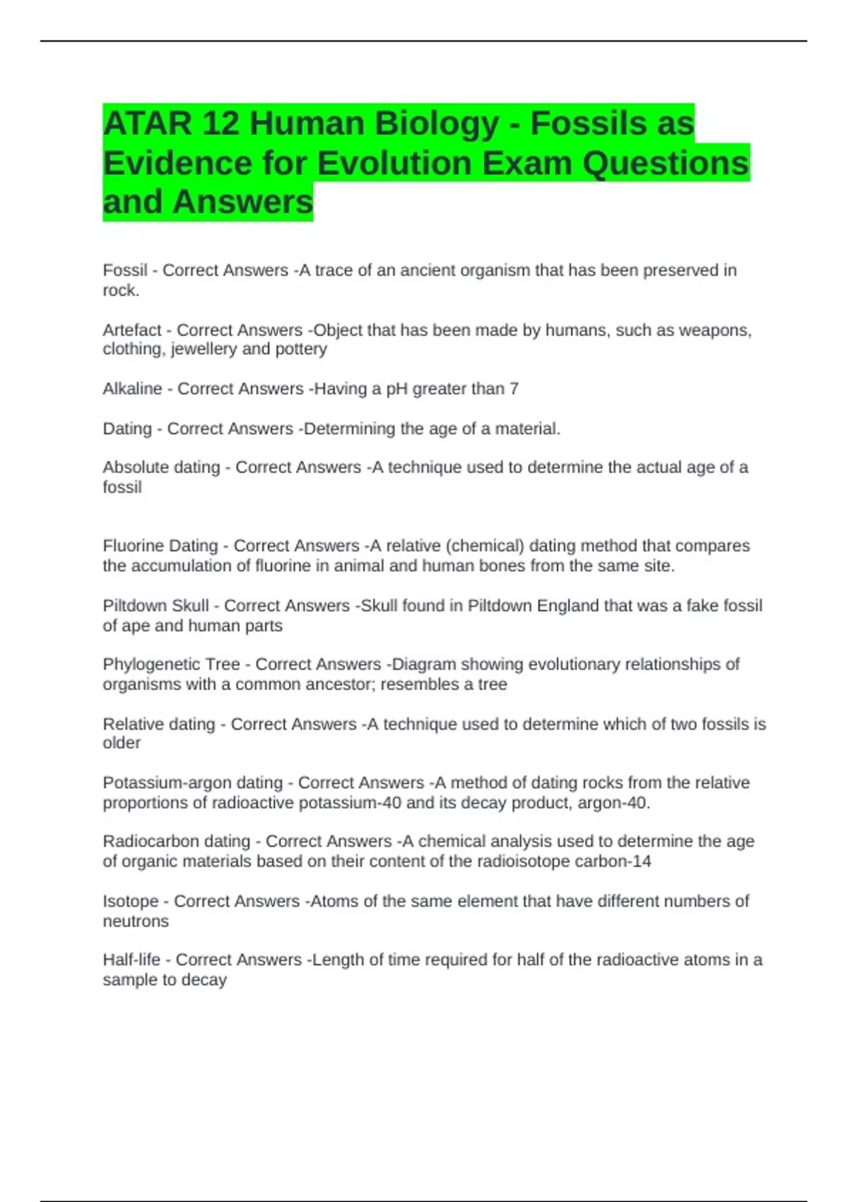 Fossil - Correct Answers -A trace of an ancient organism that has been preserved in