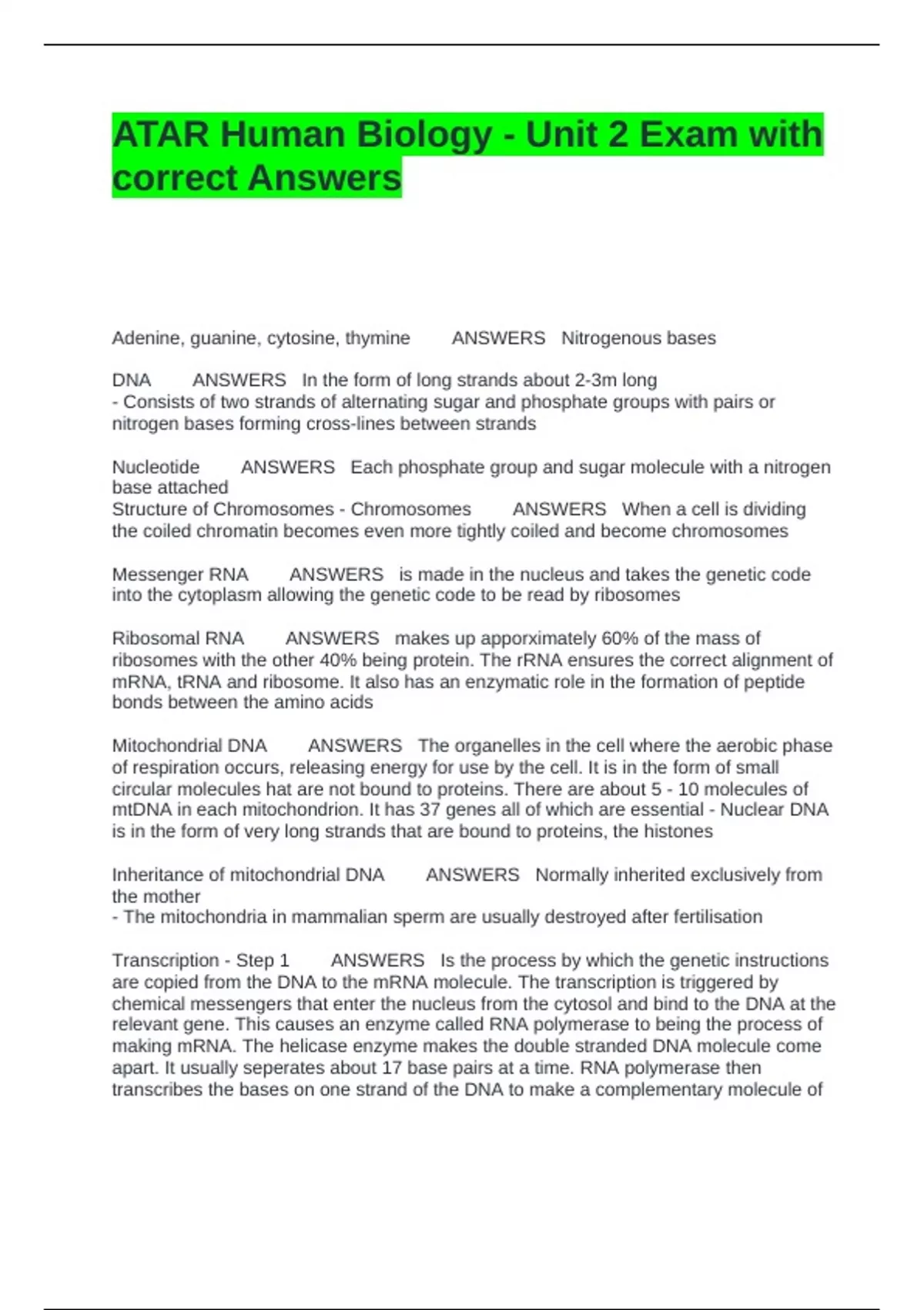 ATAR Human Biology - Unit 2 Exam with correct Answers