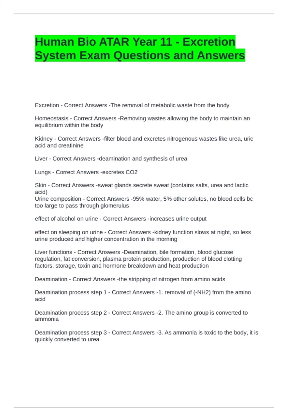 Human Bio ATAR Year 11 - Excretion System Exam Questions and Answers