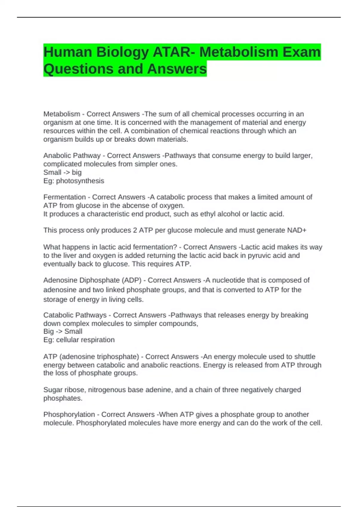 Human Biology ATAR- Metabolism Exam Questions and Answers
