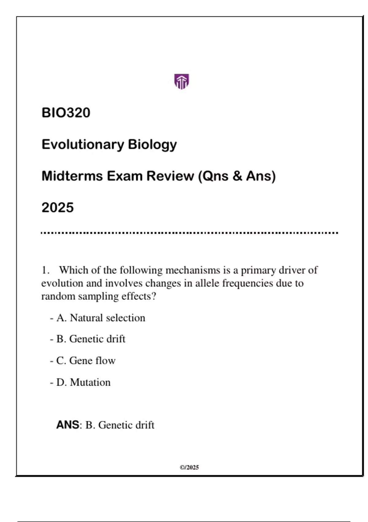 BIO320 Evolutionary Biology Midterms Exam 2 Review 2025 (Qns & Ans)BIO320 Evolutionary Biology Midterms Exam 2 Review 2025 (Qns & Ans)BIO320 Evolutionary Biology Midterms Exam 2 Review 2025 (Qns & Ans)BIO320 Evolutionary Biology Midterms Exam 2 Review 2025 (Qns & Ans)