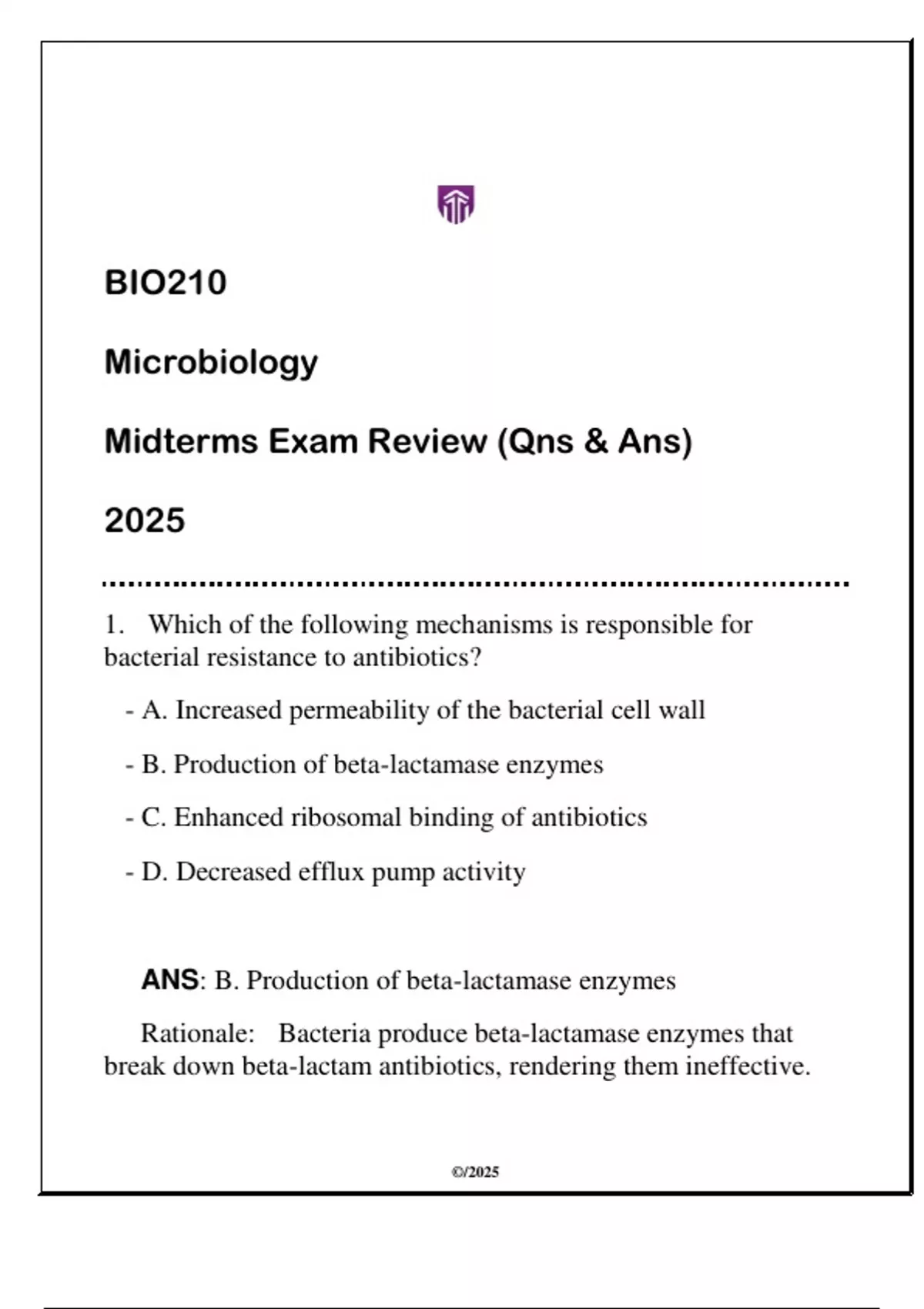 ANS: B. Production of beta-lactamase enzymes