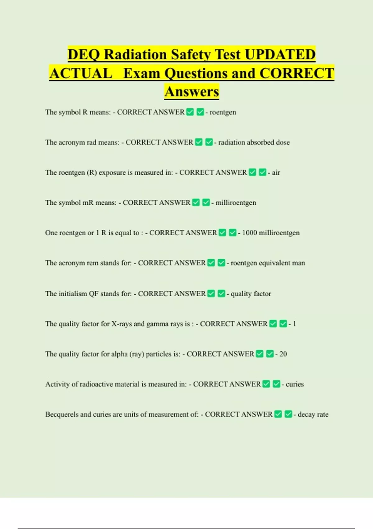 DEQ Radiation Safety Test UPDATED ACTUAL Exam Questions and CORRECT Answers The symbol R means: - CORRECT ANSWER - roentgen The acronym rad means: - CORRECT ANSWER - radiation absorbed dose The roentgen (R) exposure is measured in: - CORRECT ANSWER - air