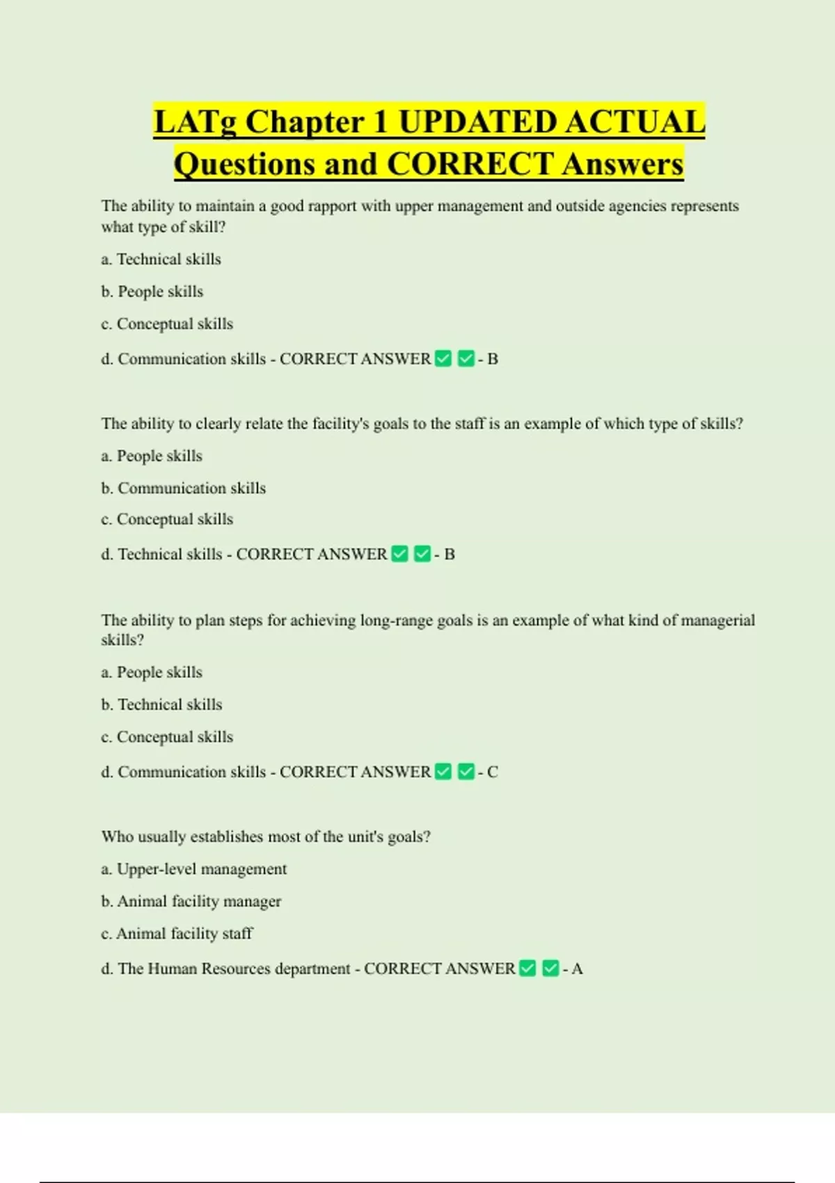 LATg Chapter 1 UPDATED ACTUAL Questions and CORRECT Answers The ability to maintain a good rapport with upper management and outside agencies represents what type of skill? a. Technical skills b. People skills c. Conceptual skills d. Communication skills - CORRECT ANSWER - B