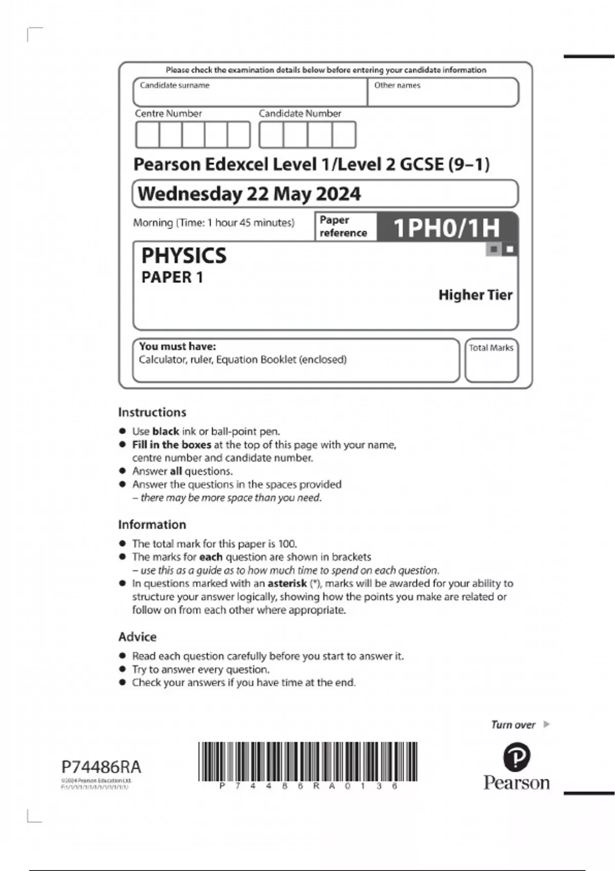 Pearson Edexcel Level 1/Level 2 GCSE (9–1) Physics PAPER 1 Higher Tier JUNE 2024 QUESTION PAPER AND MARK SCHEME