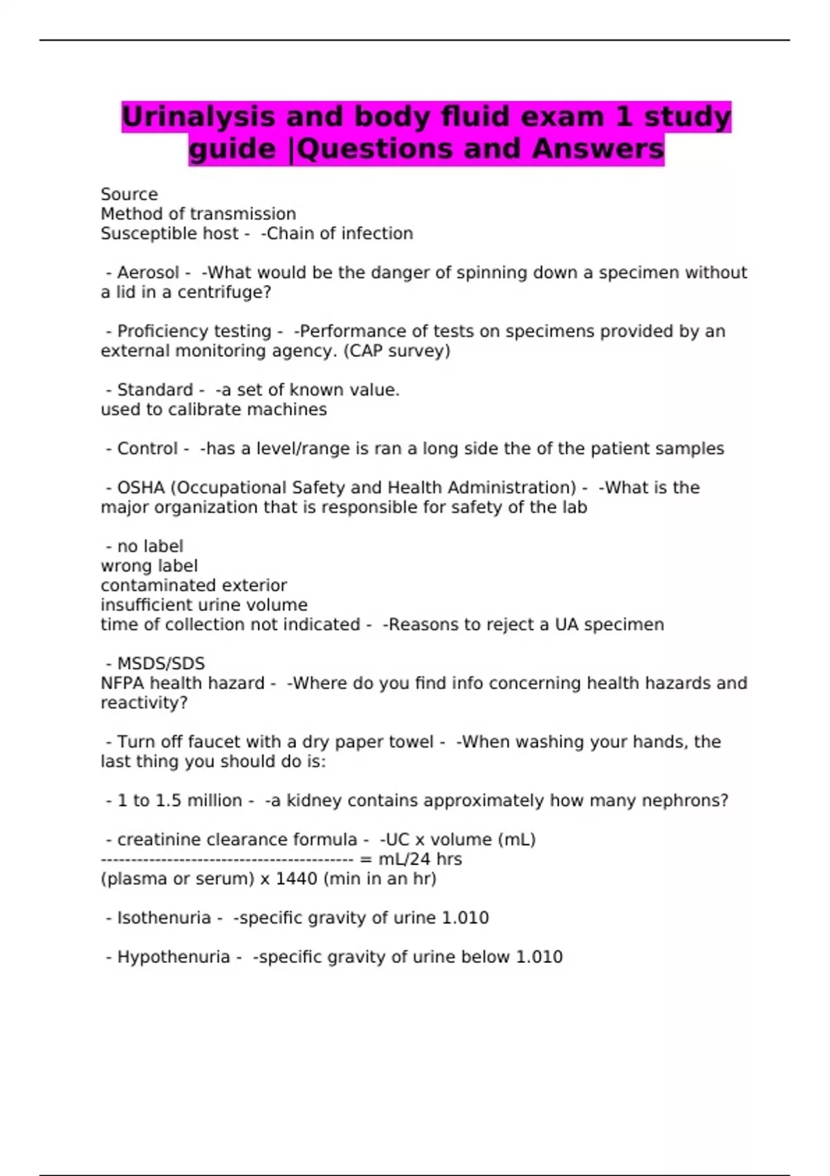 Urinalysis and body fluid exam 1 study