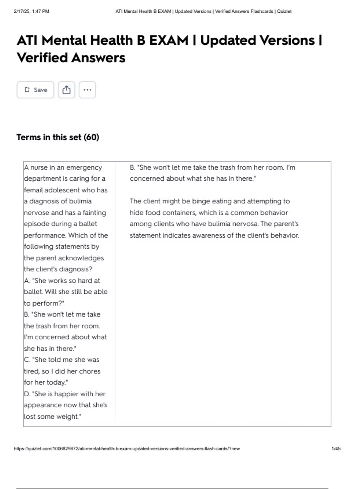 ,2/17/25, 1:47 PM ATI Mental Health B EXAM | Updated Versions | Verified Answers Flashcards | Quizlet