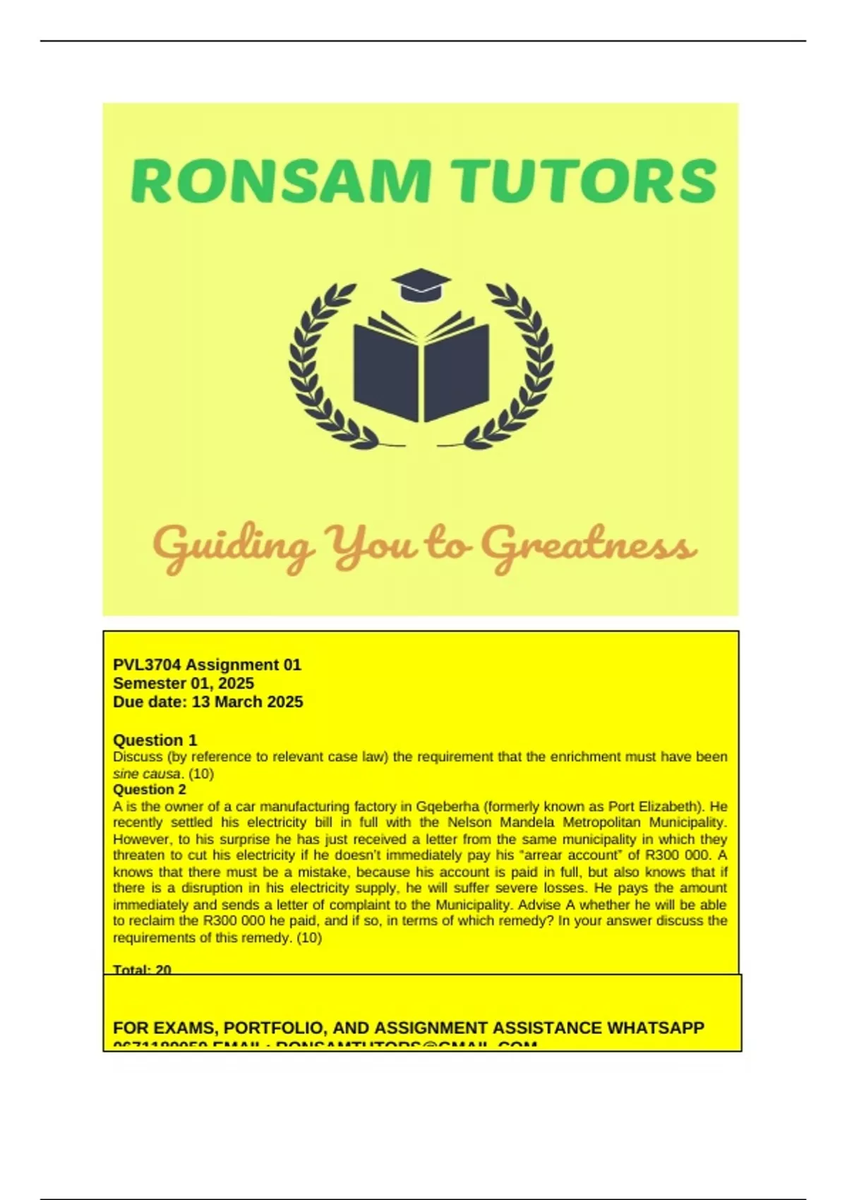 PVL3704 ASSIGNMENT 01 SEMESTER 1 DUE 13 MARCH 2025 PVL3704 Assignment 01 Semester 01, 2025 Due date: 13 March 2025 This assignment should be submitted by all students registered for the FIRST SEMESTER.  We will supply you with the general feedback to this assignment during the cause of the semester.  You must, as far as possible, use your own words when you answer the assignment. If you merely copy sections of the study guide or a textbook, you will be penalised.  It is not necessary that you provide a list of sources (bibliography) with your answers. Furthermore, please use intext referencing style to refer to relevant sources in your answer. You do not need to use footnotes in your assignment.  The length restriction for the entire assignment is six written pages or four typed pages.  Please note that one of these two questions will be marked, but you must answer both of these questions. The one unmarked will act as a self-assessment activity. However, detailed feedback to both questions will be provided. Question 1 Discuss (by reference to relevant case law) the requirement that the enrichment must have been sine causa. (10) Question 2 A is the owner of a car manufacturing factory in Gqeberha (formerly known as Port Elizabeth). He recently settled his electricity bill in full with the Nelson Mandela Metropolitan Municipality. However, to his surprise he has just received a letter from the same municipality in which they threaten to cut his electricity if he doesn’t immediately pay his “arrear account” of R300 000. A knows that there must be a mistake, because his account is paid in full, but also knows that if there is a disruption in his electricity supply, he will suffer severe losses. He pays the amount immediately and sends a letter of complaint to the Municipality. Advise A whether he will be able to reclaim the R300 000 he paid, and if so, in terms of which remedy? In your answer discuss the requirements of this remedy. (10) Total: 20
