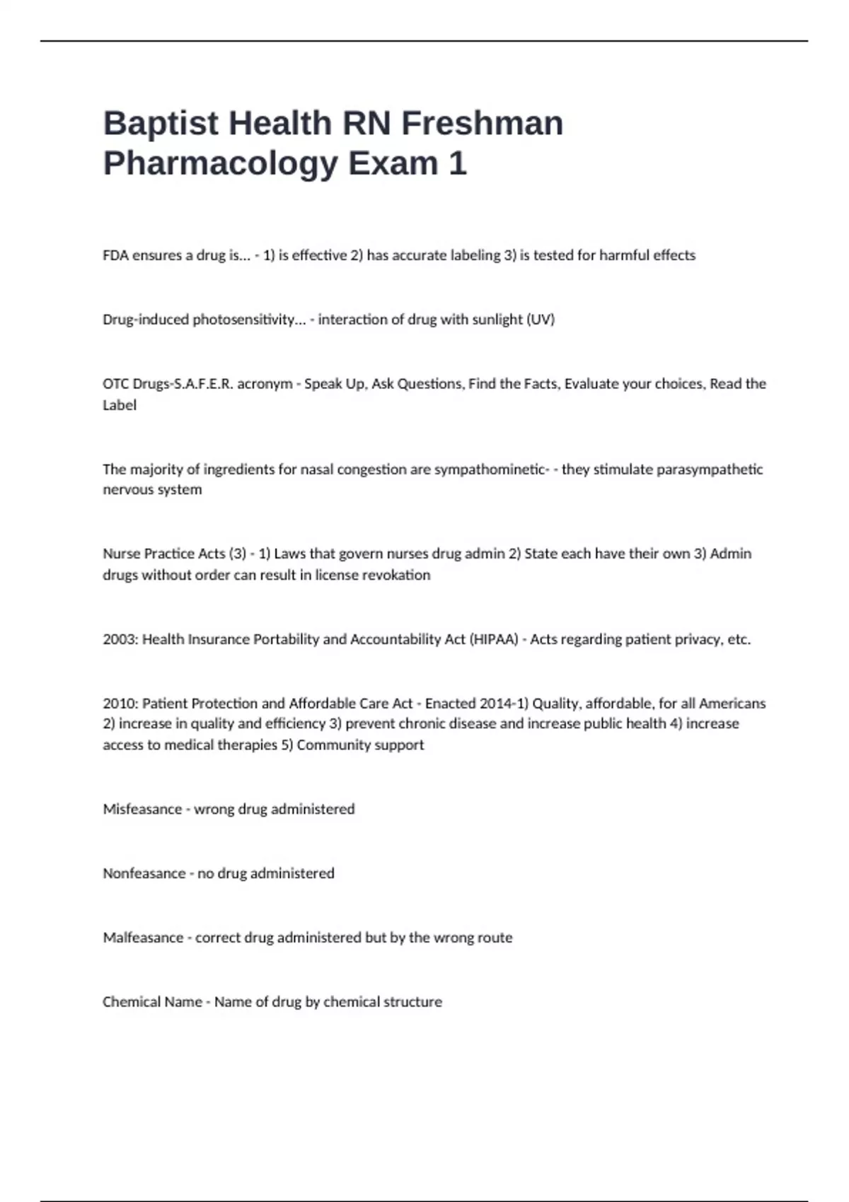 Baptist Health RN Freshman Pharmacology Exam 1 Prep Questions And Correct Answers With Detailed Rationales.
