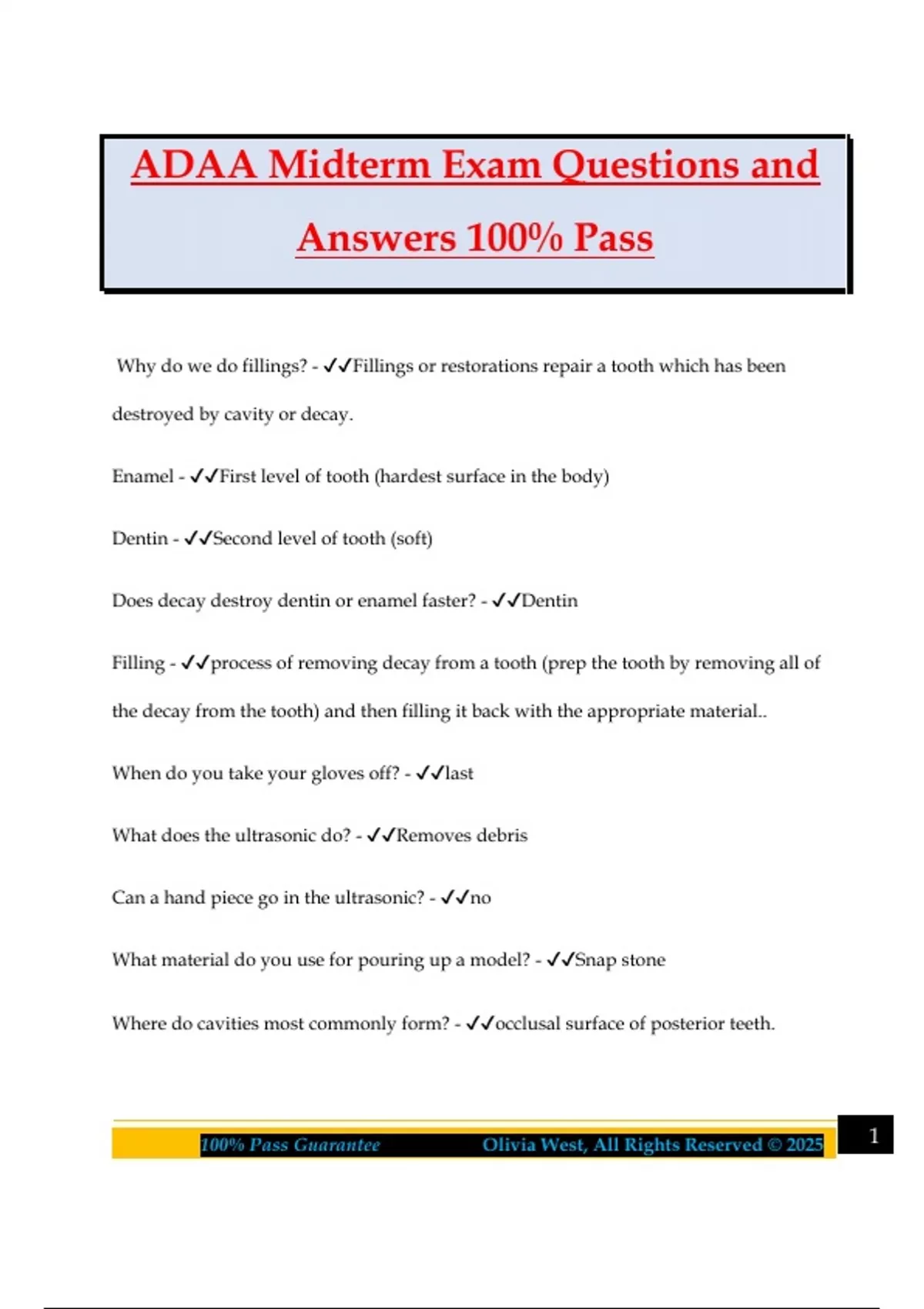 ADAA Midterm Exam Questions and Answers 100% Pass Why do we do fillings? - Fillings or restorations repair a tooth which has been destroyed by cavity or decay. Enamel - First level of tooth (hardest surface in the body) Dentin - Second level of tooth (soft) Does decay destroy dentin or enamel faster? - Dentin Filling - process of removing decay from a tooth (prep the tooth by removing all of the decay from the tooth) and then filling it back with the appropriate material.. When do you take your gloves off? - last What does the ultrasonic do? - Removes debris Can a hand piece go in the ultrasonic? - no What material do you use for pouring up a model? - Snap stone Where do cavities most commonly form? - occlusal surface of posterior teeth. 2100% Pass Guarantee Olivia West, All Rights Reserved © 2025 What teeth are amalgam fillings many used on? - posterior General Dentist - Little bit of everything Orthodontist - Braces specialist Endodontist - Root Canal Specialist Periodontist - Gum Disease Specialist Oral and Maxofacial Surgeon - Corrects disease, injury or defects by surgery Prosthodontist - Prosthetic Specialist Pedodontist - children specialist Madible - Lower Jaw that holds teeth Maxilla - upper jaw that holds teeth condyles - the round prominence at the end of the TMJ allowing t