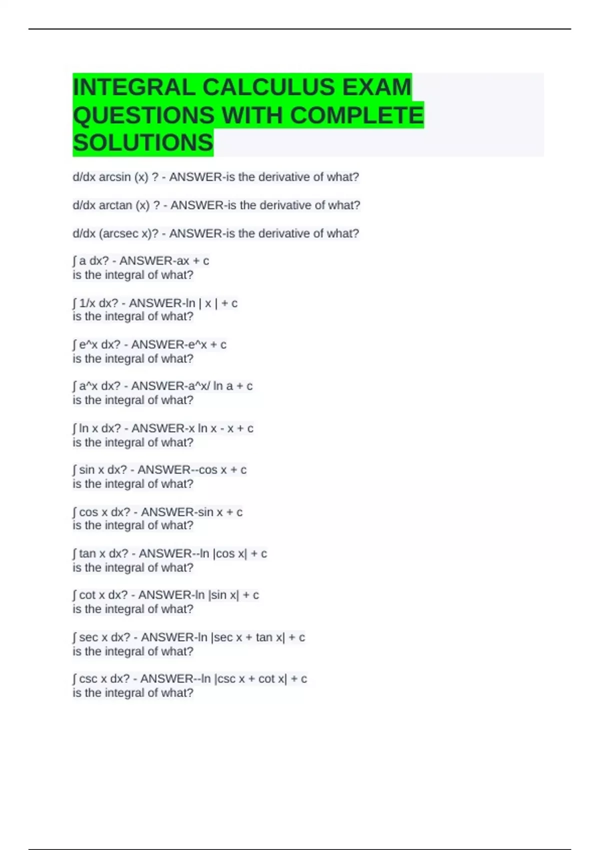 INTEGRAL CALCULUS EXAM QUESTIONS WITH COMPLETE SOLUTIONS