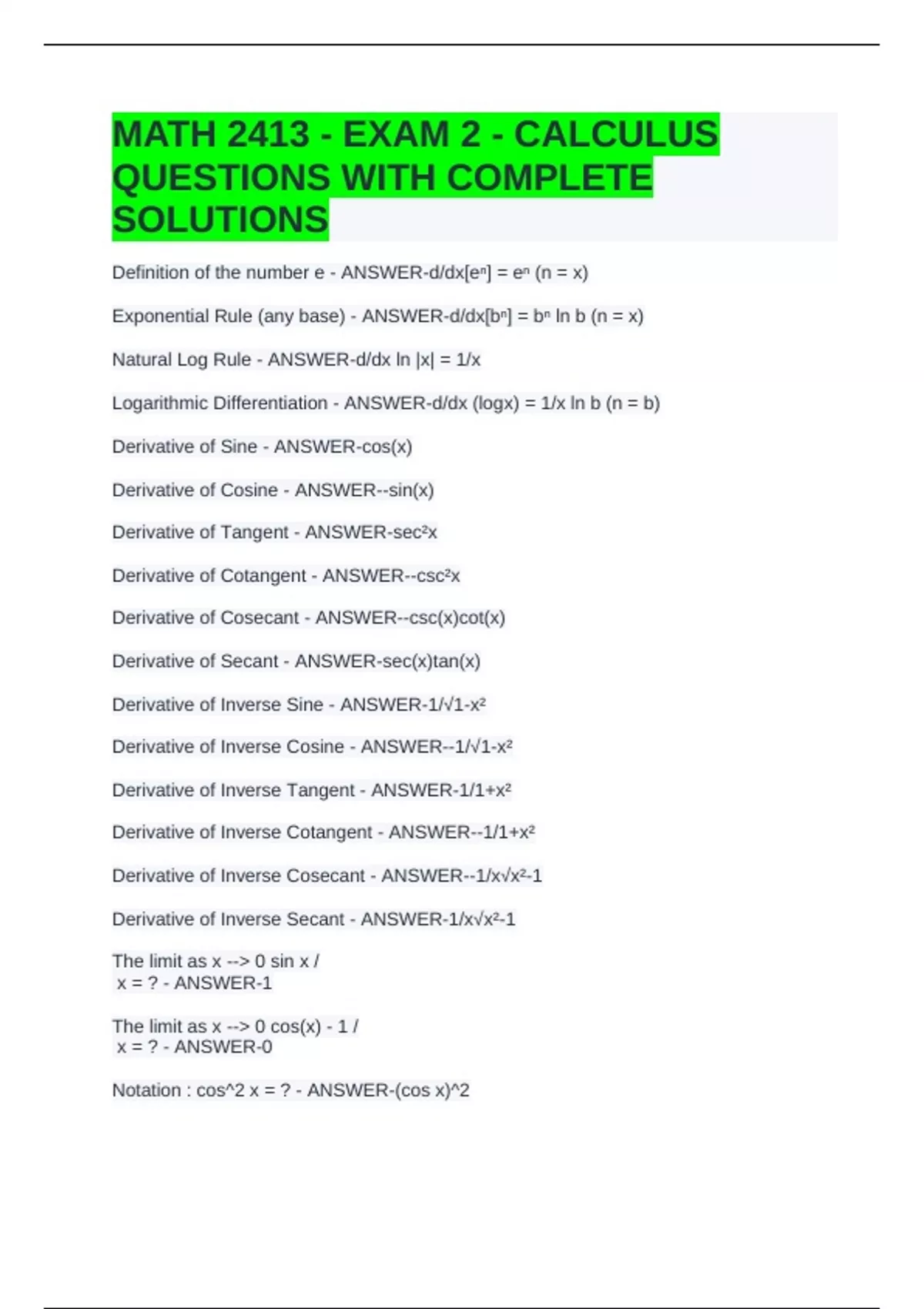 MATH 2413 - EXAM 2 - CALCULUS QUESTIONS WITH COMPLETE SOLUTIONS