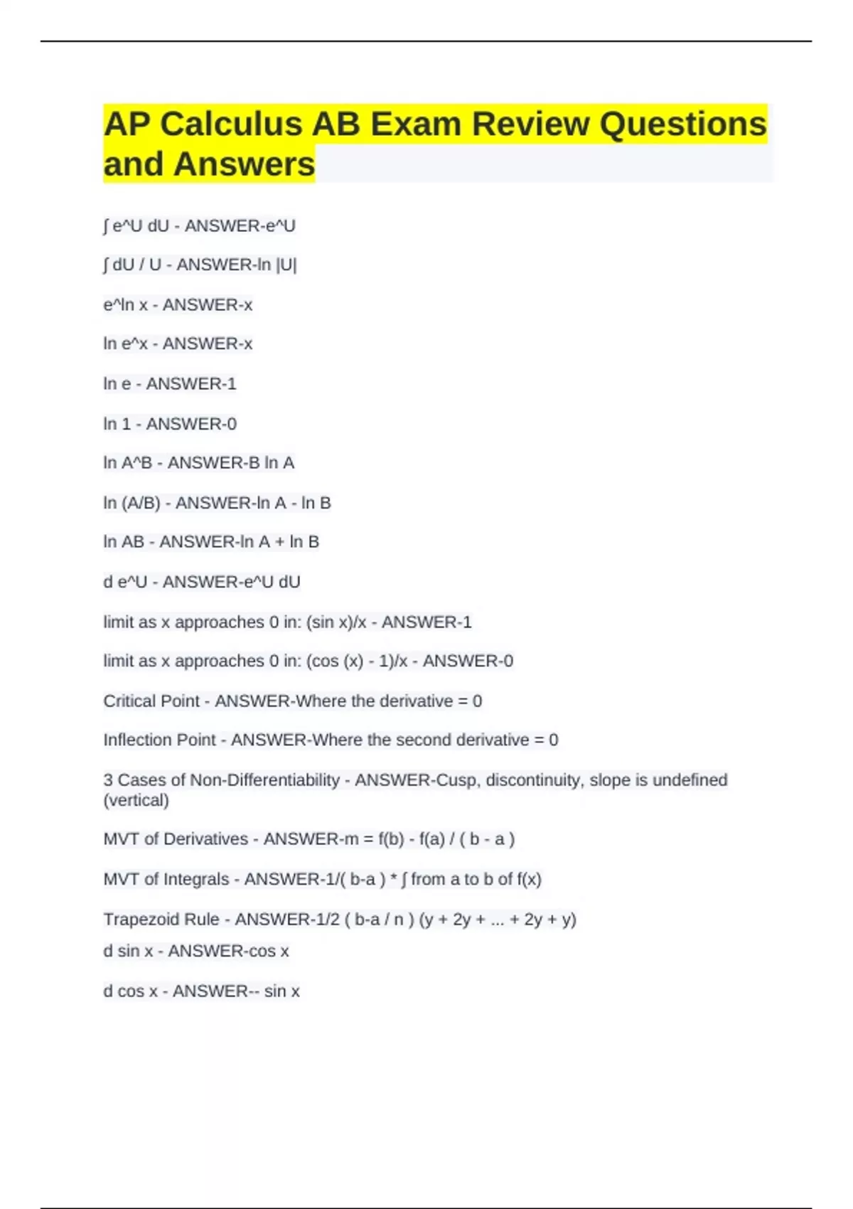 AP CALCULUS AB EXAM REVIEW QUESTIONS AND ANSWERS