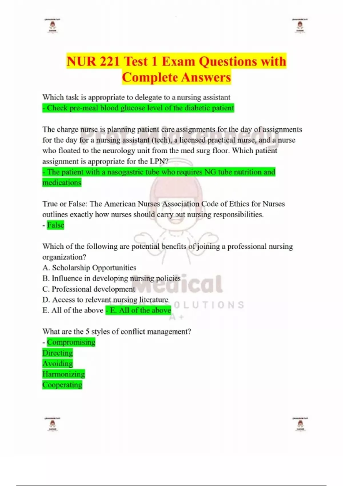 NUR 221 Test 1 Exam Questions with Complete Answers-Which task is appropriate to delegate to a nursing assistant - Check pre-meal blood glucose level of the diabetic patient The charge nurse is planning patient care assignments for the day of assignments for the day for a nursing assistant (tech), a licensed practical nurse, and a nurse who floated to the neurology unit from the med surg floor. Which patient assignment is appropriate for the LPN? - The patient with a nasogastric tube who requires NG tube nutrition and medications True or False: The American Nurses Association Code of Ethics for Nurses outlines exactly how nurses should carry out nursing responsibilities. - False Which of the following are potential benefits of joining a professional nursing organization? A. Scholarship Opportunities B. Influence in developing nursing policies C. Professional development D. Access to relevant nursing literature E. All of the above - E. All of the above What are the 5 styles of conflict management? - Compromising Directing Avoiding Harmonizing Cooperating The charge nurse asks Sharon to work this Thanksgiving and promises she'll have Christmas Day off. Shortly after Thanksgiving, she tells Sharon she will no longer be able to honor the upcoming holiday off. Rather than approaching the charge nurse, Sharon decides to work the holiday. What style of conflict management does Sharon show in the scenario above? - Avoiding