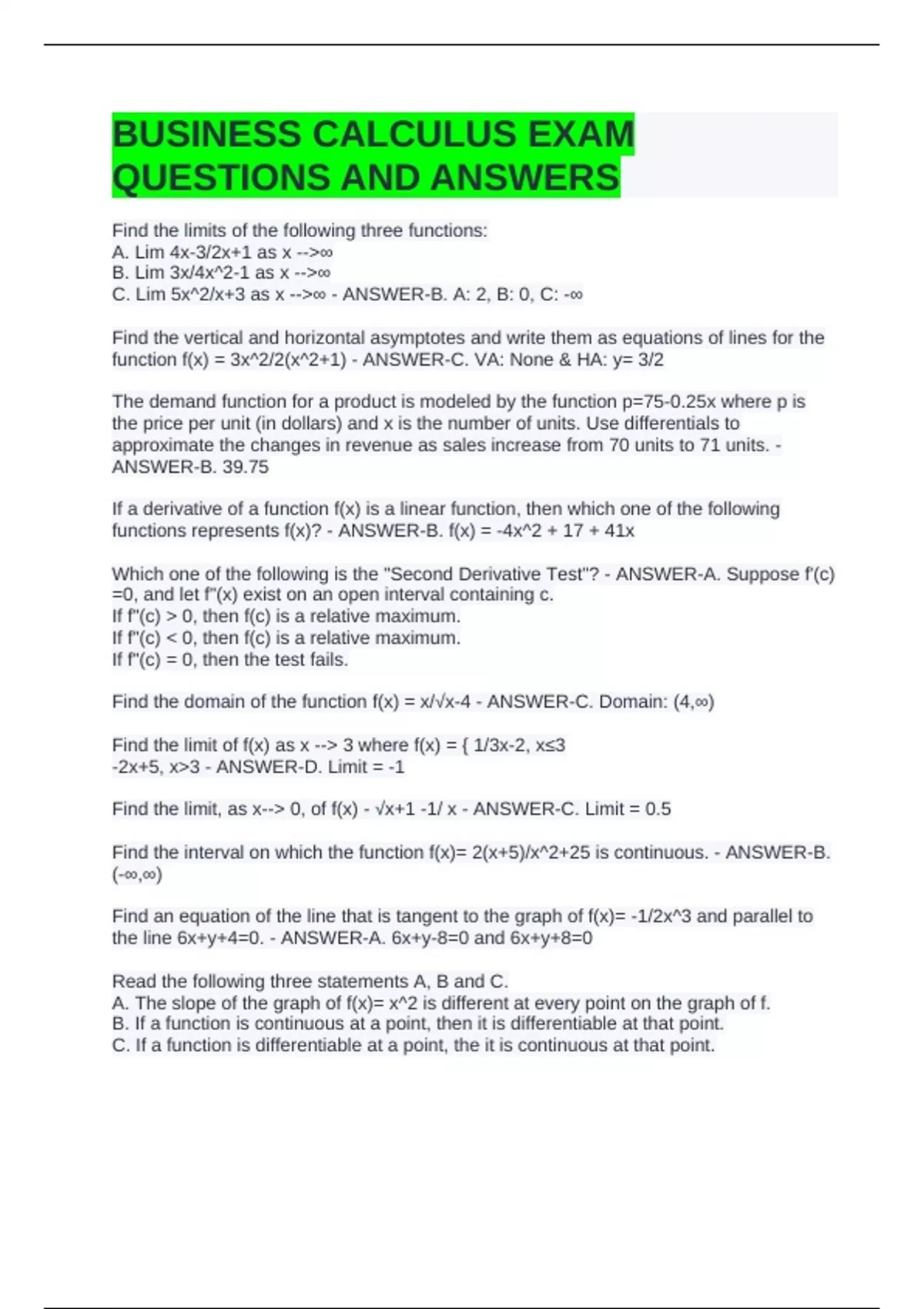BUSINESS CALCULUS EXAM QUESTIONS AND ANSWERS
