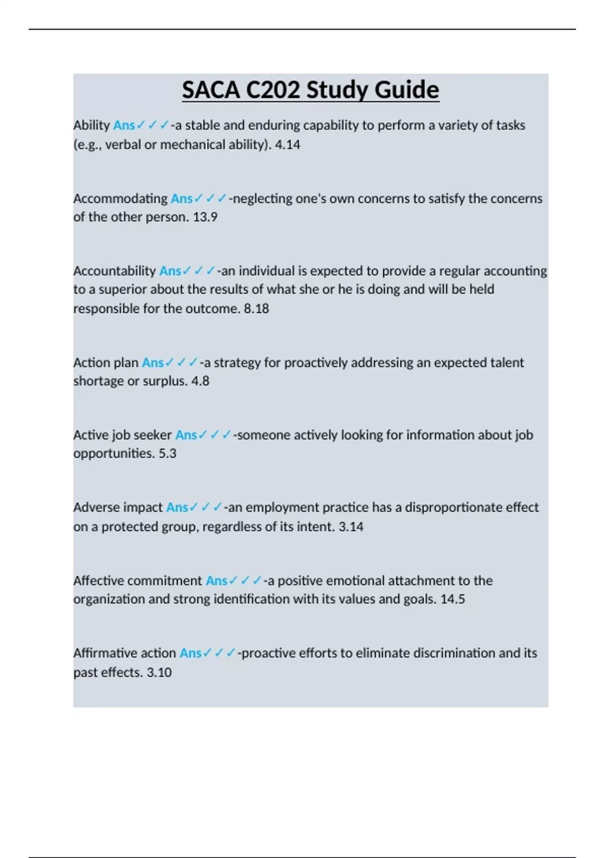 Ability Ans-a stable and enduring capability to perform a variety of tasks (e.g., verbal or mechanical ability). 4.14 Accommodating Ans-neglecting one's own concerns to satisfy the concerns of the other person. 13.9 Accountability Ans-an individual is expected to provide a regular accounting to a superior about the results of what she or he is doing and will be held responsible for the outcome. 8.18 Action plan Ans-a strategy for proactively addressing an expected talent shortage or surplus. 4.8 Active job seeker Ans-someone actively looking for information about job opportunities. 5.3 Adverse impact Ans-an employment practice has a disproportionate effect on a protected group, regardless of its intent. 3.14 Affective commitment Ans-a positive emotional attachment to the organization and strong identification with its values and goals. 14.5 Affirmative action Ans-proactive efforts to eliminate discrimination and its past effects. 3.10