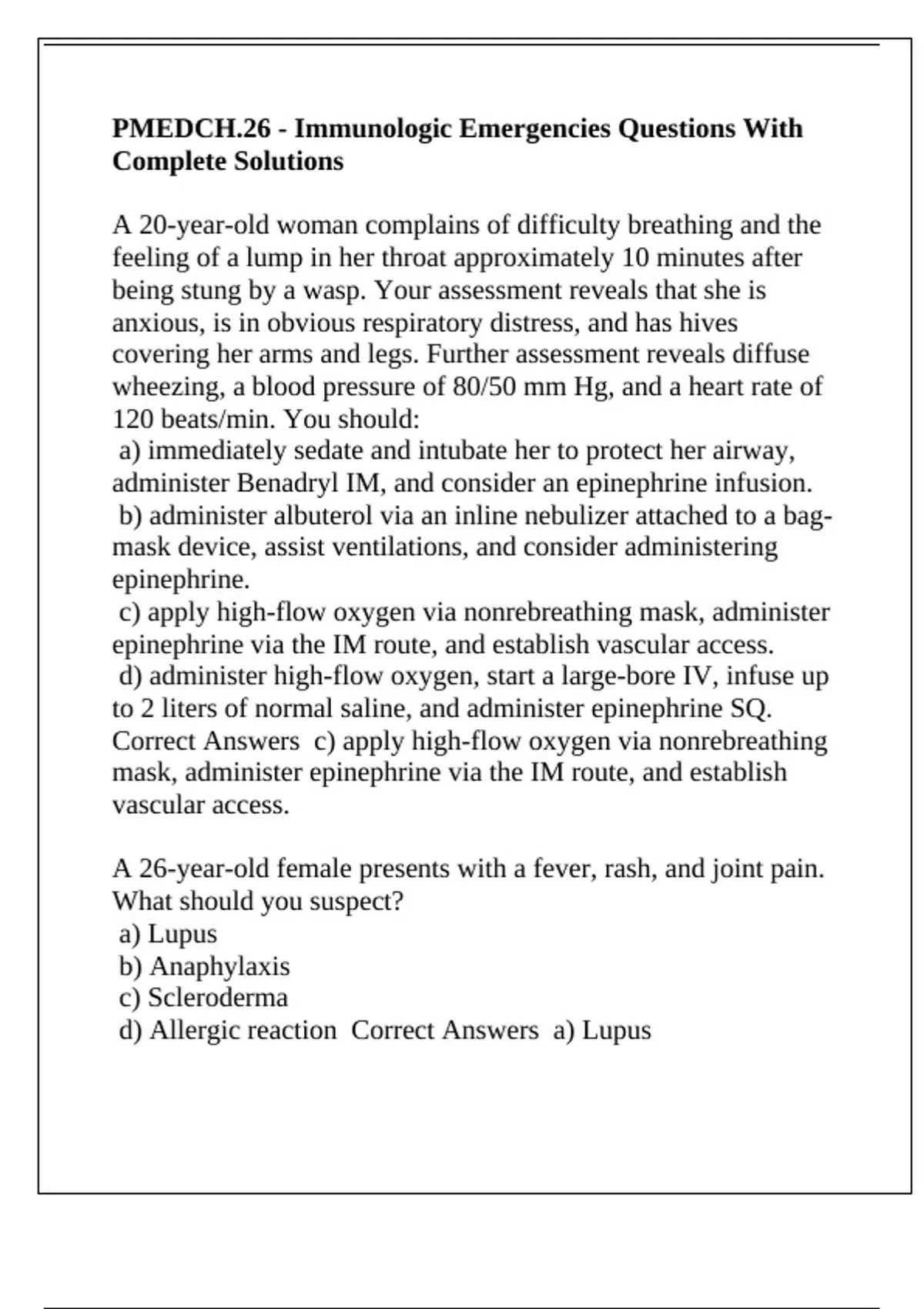 PMEDCH.26 - Immunologic Emergencies Questions With Complete Solutions