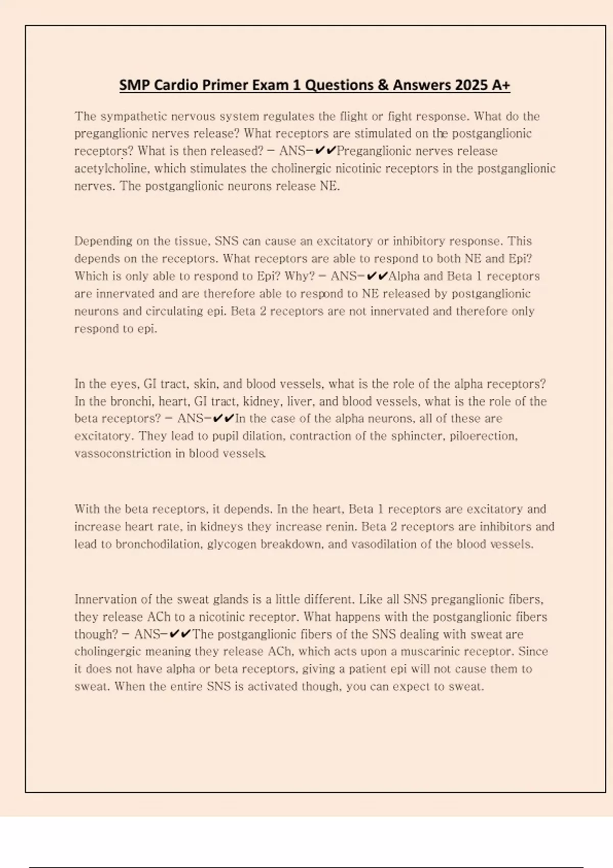 SMP Cardio Primer Exam 1 Questions & Answers 2025 A+ The sympathetic nervous system regulates the flight or fight response. What do the preganglionic nerves release? What receptors are stimulated on the postganglionic receptors? What is then released? - ANS-Preganglionic nerves release acetylcholine, which stimulates the cholinergic nicotinic receptors in the postganglionic nerves. The postganglionic neurons release NE. Depending on the tissue, SNS can cause an excitatory or inhibitory response. This depends on the receptors. What receptors are able to respond to both NE and Epi? Which is only able to respond to Epi? Why? - ANS-Alpha and Beta 1 receptors are innervated and are therefore able to respond to NE released by postganglionic neurons and circulating epi. Beta 2 receptors are not innervated and therefore only respond to epi. In the eyes, GI tract, skin, and blood vessels, what is the role of the alpha receptors? In the bronchi, heart, GI tract, kidney, liver, and blood vessels, what is the role of the beta receptors? - ANS-In the case of the alpha neurons, all of these are excitatory. They lead to pupil dilation, contraction of the sphincter, piloerection, vassoconstriction in blood vessels. With the beta receptors, it depends. In the heart, Beta 1 receptors are excitatory and increase heart rate, in kidneys they increase renin. Beta 2 receptors are inhibitors and lead to bronchodilation, glycogen breakdown, and vasodilation of the blood vessels. Innervation of the sweat glands is a little different. Like all SNS preganglionic fibers, they release ACh to a nicotinic receptor. What happens with the postganglionic fibers though? - ANS-