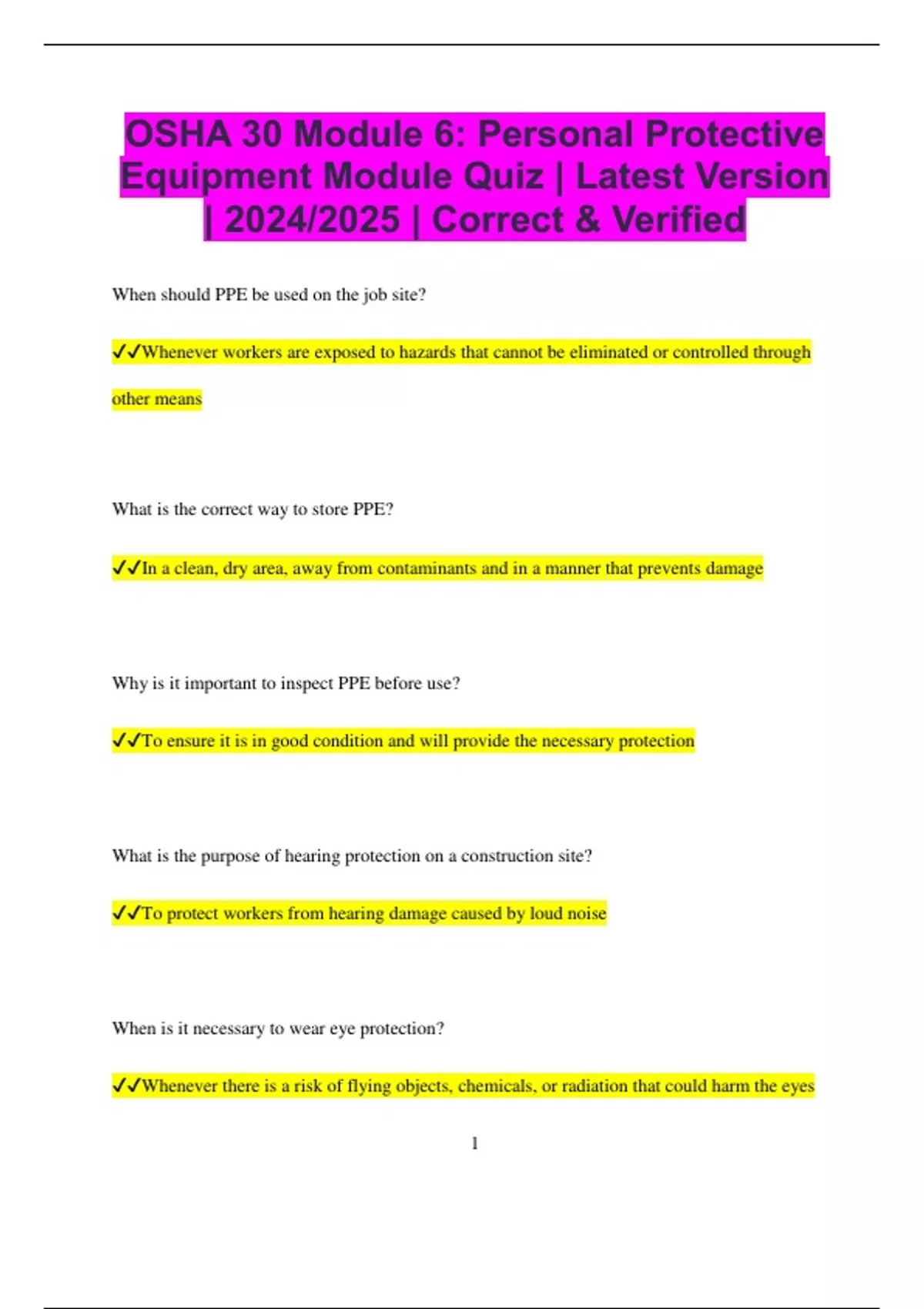 OSHA 30 Module 6: Personal Protective Equipment Module Quiz | Latest Version | 2024/2025 | Correct & Verified