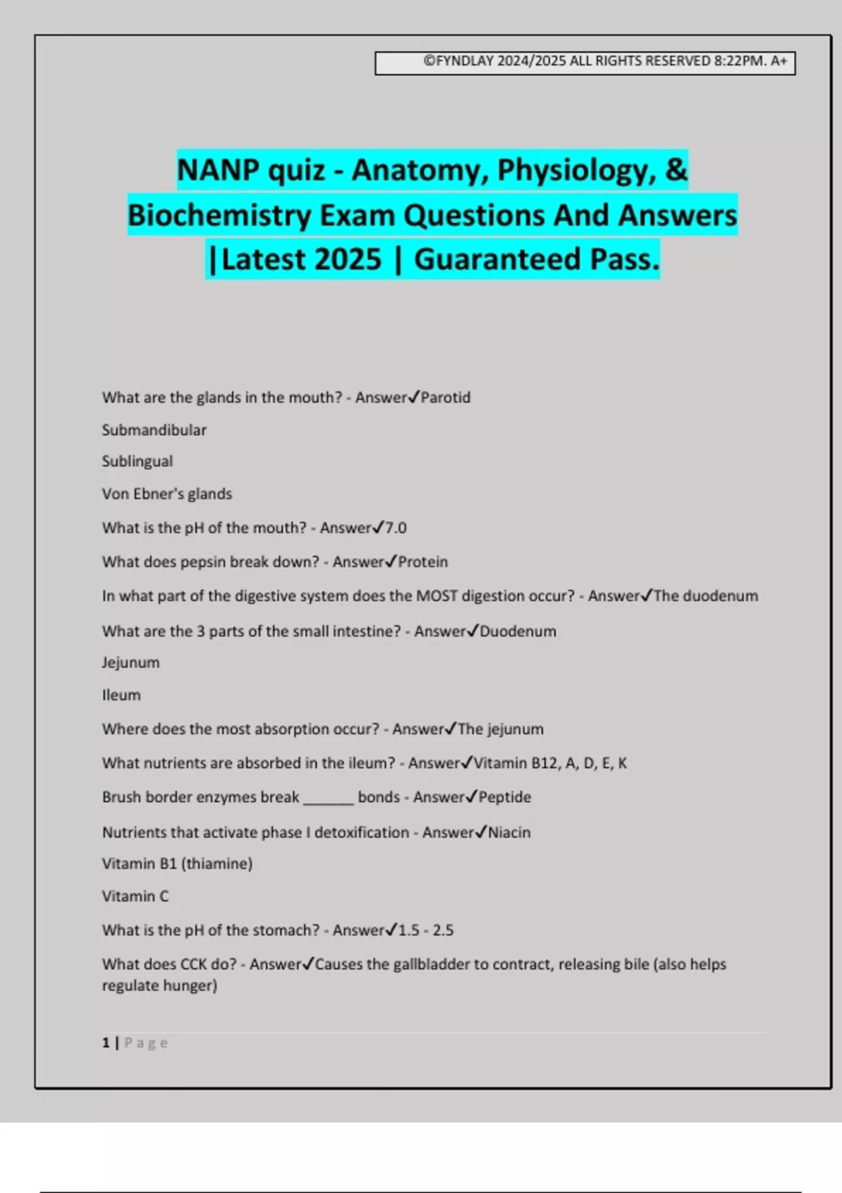 ©FYNDLAY 2024/2025 ALL RIGHTS RESERVED 8:22PM. A+ 1 | P a g e NANP quiz - Anatomy, Physiology, & Biochemistry Exam Questions And Answers |Latest 2025 | Guaranteed Pass. What are the glands in the mouth? - AnswerParotid Submandibular Sublingual Von Ebner's glands What is the pH of the mouth? - Answer7.0 What does pepsin break down? - AnswerProtein In what part of the digestive system does the MOST digestion occur? - AnswerThe duodenum What are the 3 parts of the small intestine? - AnswerDuodenum Jejunum Ileum Where does the most absorption occur? - AnswerThe jejunum What nutrients are absorbed in the ileum? - AnswerVitamin B12, A, D, E, K Brush border enzymes break ______ bonds - AnswerPeptide Nutrients that activate phase I detoxification - AnswerNiacin Vitamin B1 (thiamine) Vitamin C What is the pH of the stomach? - Answer1.5 - 2.5 What does CCK do? - AnswerCause