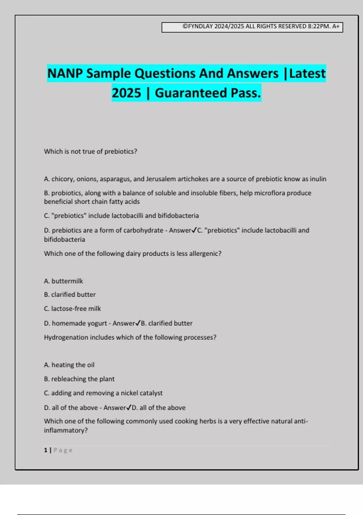 ©FYNDLAY 2024/2025 ALL RIGHTS RESERVED 8:22PM. A+ 1 | P a g e NANP Sample Questions And Answers |Latest 2025 | Guaranteed Pass. Which is not true of prebiotics? A. chicory, onions, asparagus, and Jerusalem artichokes are a source of prebiotic know as inulin B. probiotics, along with a balance of soluble and insoluble fibers, help microflora produce beneficial short chain fatty acids C. "prebiotics" include lactobacilli and bifidobacteria D. prebiotics are a form of carbohydrate - AnswerC. "prebiotics" include lactobacilli and bifidobacteria Which one of the following dairy products is less allergenic? A. buttermilk B. clarified butter C. lactose-free milk D. homemade yogurt - AnswerB. clarified butter Hydrogenation includes which of the following processes? A. heating the oil B. rebleaching the plant C. adding and removing a nickel catalyst D. all of the above - AnswerD. all of the above Which one of the following commonly