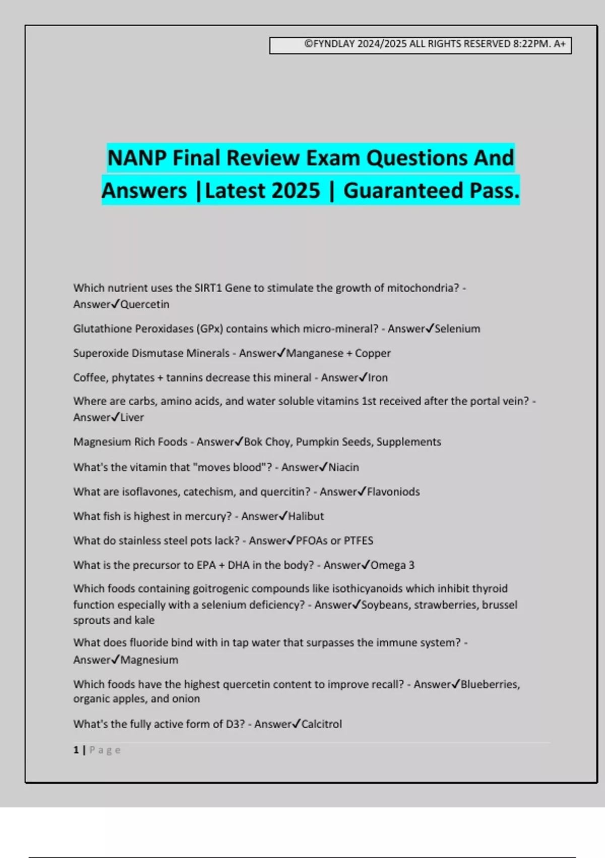 ©FYNDLAY 2024/2025 ALL RIGHTS RESERVED 8:22PM. A+ 1 | P a g e NANP Final Review Exam Questions And Answers |Latest 2025 | Guaranteed Pass. Which nutrient uses the SIRT1 Gene to stimulate the growth of mitochondria? - AnswerQuercetin Glutathione Peroxidases (GPx) contains which micro-mineral? - AnswerSelenium Superoxide Dismutase Minerals - AnswerManganese + Copper Coffee, phytates + tannins decrease this mineral - AnswerIron Where are carbs, amino acids, and water soluble vitamins 1st received after the portal vein? - AnswerLiver Magnesium Rich Foods - AnswerBok Choy, Pumpkin Seeds, Supplements What's the vitamin that "moves blood"? - AnswerNiacin What are isoflavones, catechism, and quercitin? - AnswerFlavoniods What fish is highest in mercury? - AnswerHalibut What do stainless steel pots lack? - AnswerPFOAs or PTFES What is the precursor to EPA + DHA in the body? - AnswerOmega 3 Which foods containing goitrogenic compounds like isothicyanoids which inhibit thyroid function especially with a selenium deficiency? - AnswerSoybeans, strawberries, brussel sprouts and kale What does fluoride bind with in tap water that surpasses the immune system? - AnswerMagnesium Which foods have the highest quercetin content to improve recall? - AnswerBlueberries, organic apples, and onion What's the fully active form of D3?
