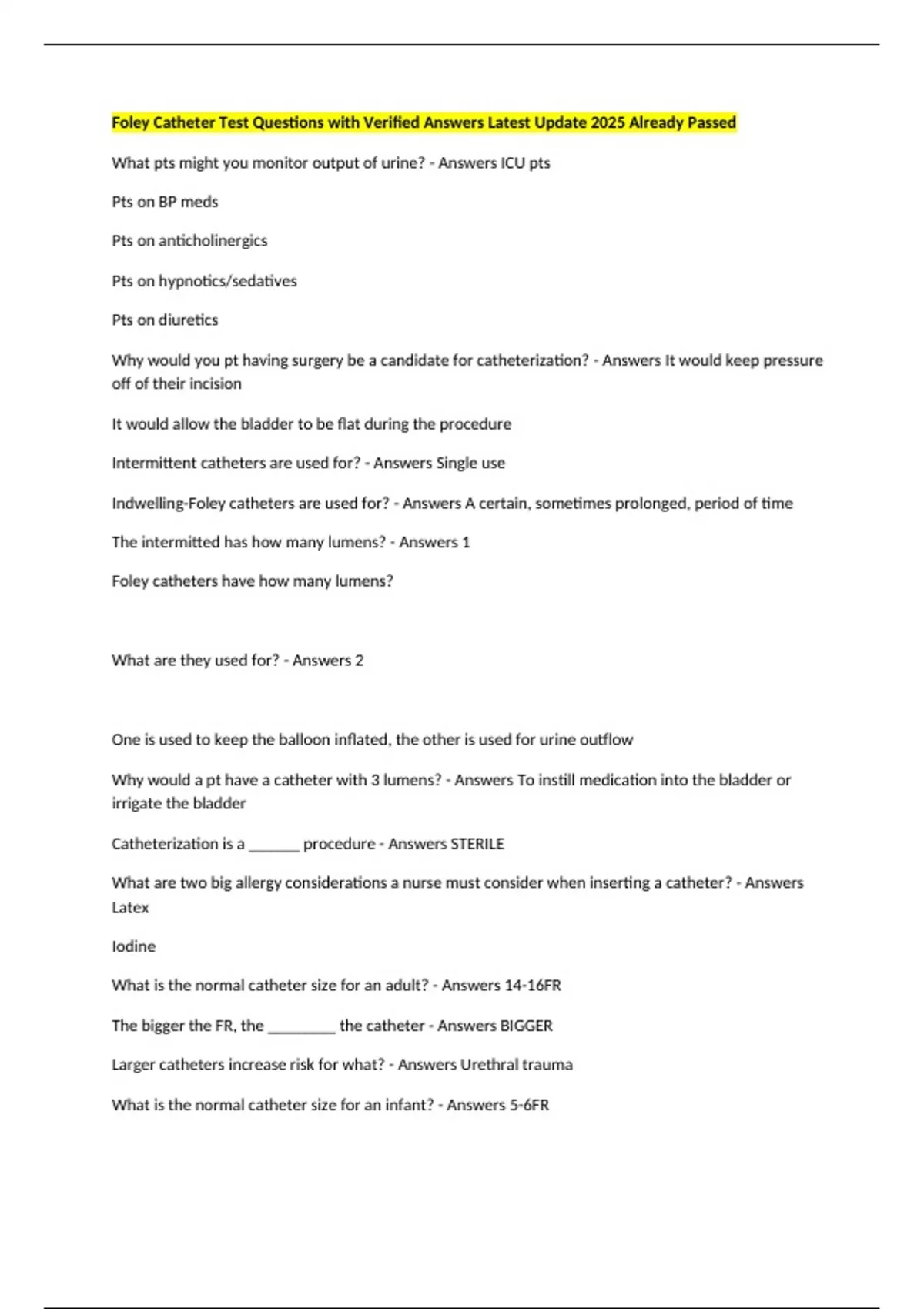 Foley Catheter Test Questions with Verified Answers Latest Update 2025 Already Passed What pts might you monitor output of urine? - Answers ICU pts Pts on BP meds Pts on anticholinergics Pts on hypnotics/sedatives Pts on diuretics Why would you pt having surgery be a candidate for catheterization? - Answers It would keep pressure off of their incision It would allow the bladder to be flat during the procedure Intermittent catheters are used for? - Answers Single use Indwelling-Foley catheters are used for? - Answers A certain, sometimes prolonged, period of time The intermitted has how many lumens? - Answers 1 Foley catheters have how many lumens? What are they used for? - Answers 2 One is used to keep the balloon inflated, the other is used for urine outflow Why would a pt have a catheter with 3 lumens? - Answers To instill medication into the bladder or irrigate the bladder Catheterization is a ______ procedure - Answers STERILE What are two big allergy considerations a nurse must consider when inserting a catheter? - Answers Latex Iodine What is the normal catheter size for an adult? - Answers 14-16FR The bigger the FR, the ________ the catheter - Answers BIGGER Larger catheters increase risk for what? - Answers Urethral trauma What is the normal catheter size for an infant? - Answers 5-6FR What is the normal catheter size for a child? - Answers 8-10FR What is the normal catheter size for a young girl? - Answers 12FR What is the recommended balloon size for adults? - Answers 10ML You should hang the catheter bag _______ , and never let it ________ - Answers below the bladder - touch the floor When might a larger catheter be used? - Answers After a urological surgery, such as a prostate surgery When the pt has a large amount of hematuria Emptying the drainage bag when 1/2 full does what? - Answers reduces tension and pulling on the catheter tube What should you do if there is an absence of urine? - Answers Make sure the tube is not kinked or occluded When would a suprapubic catheter be inserted? - Answers When there is a blockage of the urethra such as : Enlarged prostate urethral stricture urological surgery Or when long term catheterization has irritated the urethra What type of tape should you use when using a condom catheter? - Answers Elastic tape Allow _____in. to _____in between the tip of the condom catheter and the penis. - Answers 1-2 What can you ask a pt when inquiring if they have an iodine allergy? - Answers If they are allergic to shellfish If you have a confused client you should ... - Answers Get extra help to assist in the procedure What should be underneath the pt when inserting a catheter?? - Answers A water proof pad What should you do before you insert a catheter? - Answers Provide perineal hygiene using