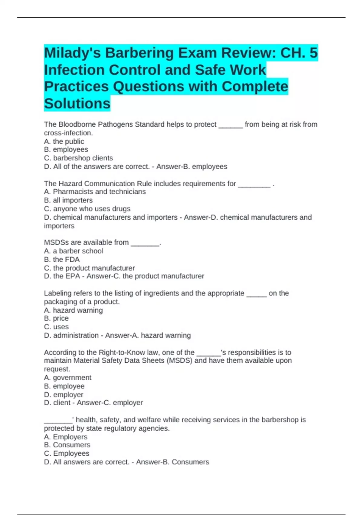 Milady's Barbering Exam Review: CH. 5 Infection Control and Safe Work Practices Questions with Complete Solutions