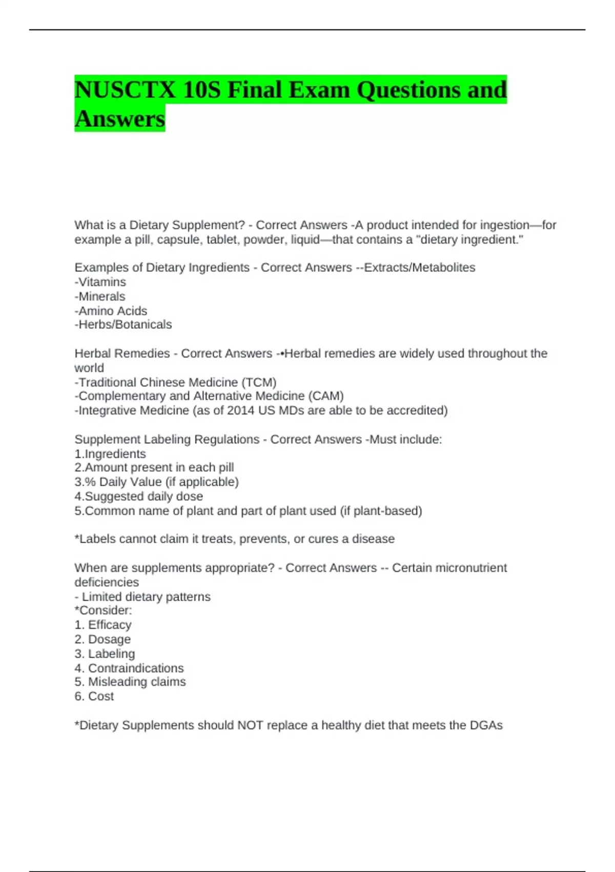 NUSCTX 10S Final Exam Questions and Answers